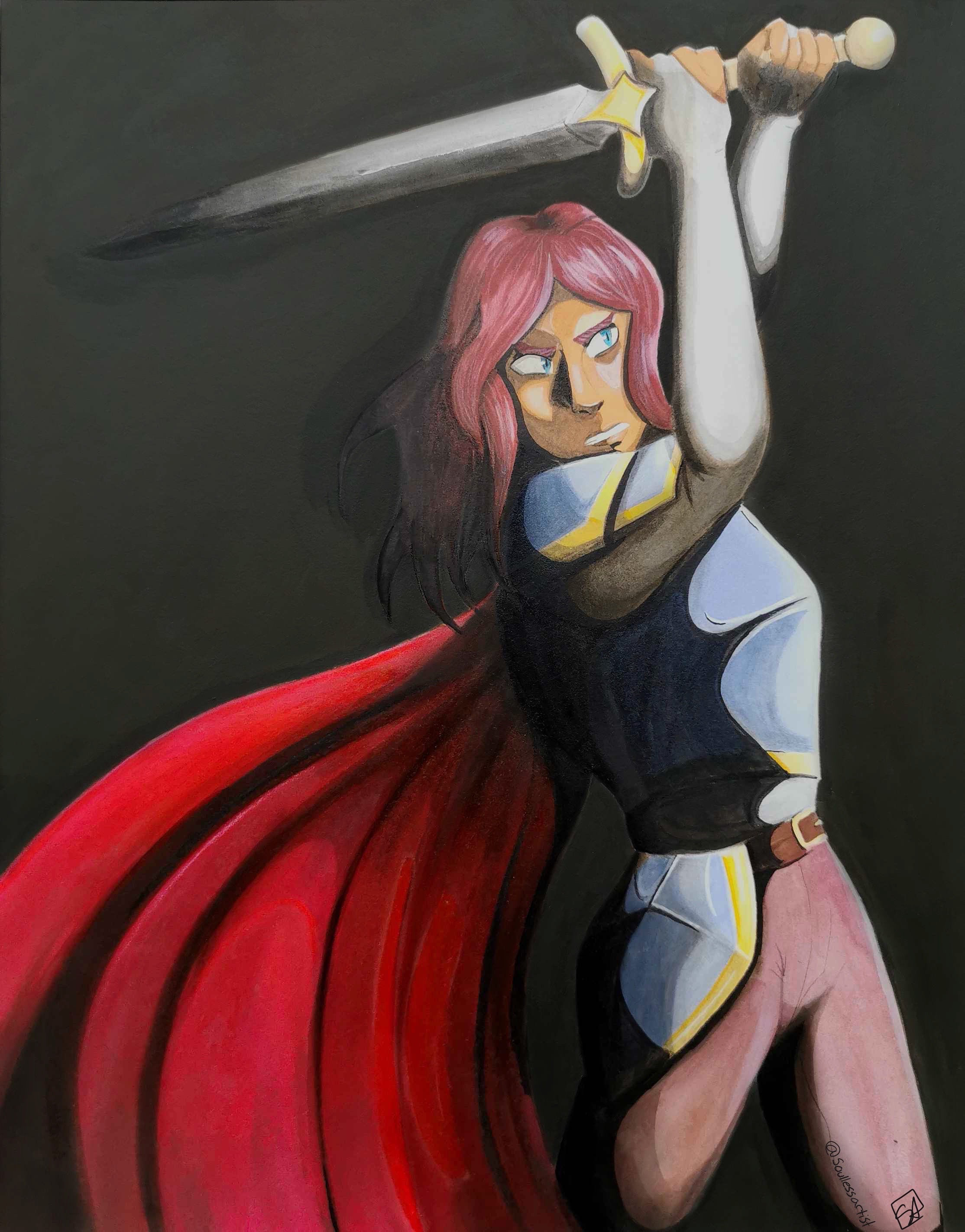 This piece was originally created with ink, markers, pencil crayons, and acrylic paint. For this upload I did edit a few things, mostly the background because there was some glare from when I took the picture.This piece was one I completed for school, the assignment was to use a chiaroscuro technique. So with inspiration from fantasy elements, like Dungeons and Dragons, and my love of character design, I created this piece where the dramatic lighting cuts a bold figure from the shadows to tell a story of a courageous fighter. This piece was originally created with ink, markers, pencil crayons, and acrylic paint. For this upload I did edit a few things, mostly the background because there was some glare from when I took the picture.0 Comments 0 Shares 7 Views -