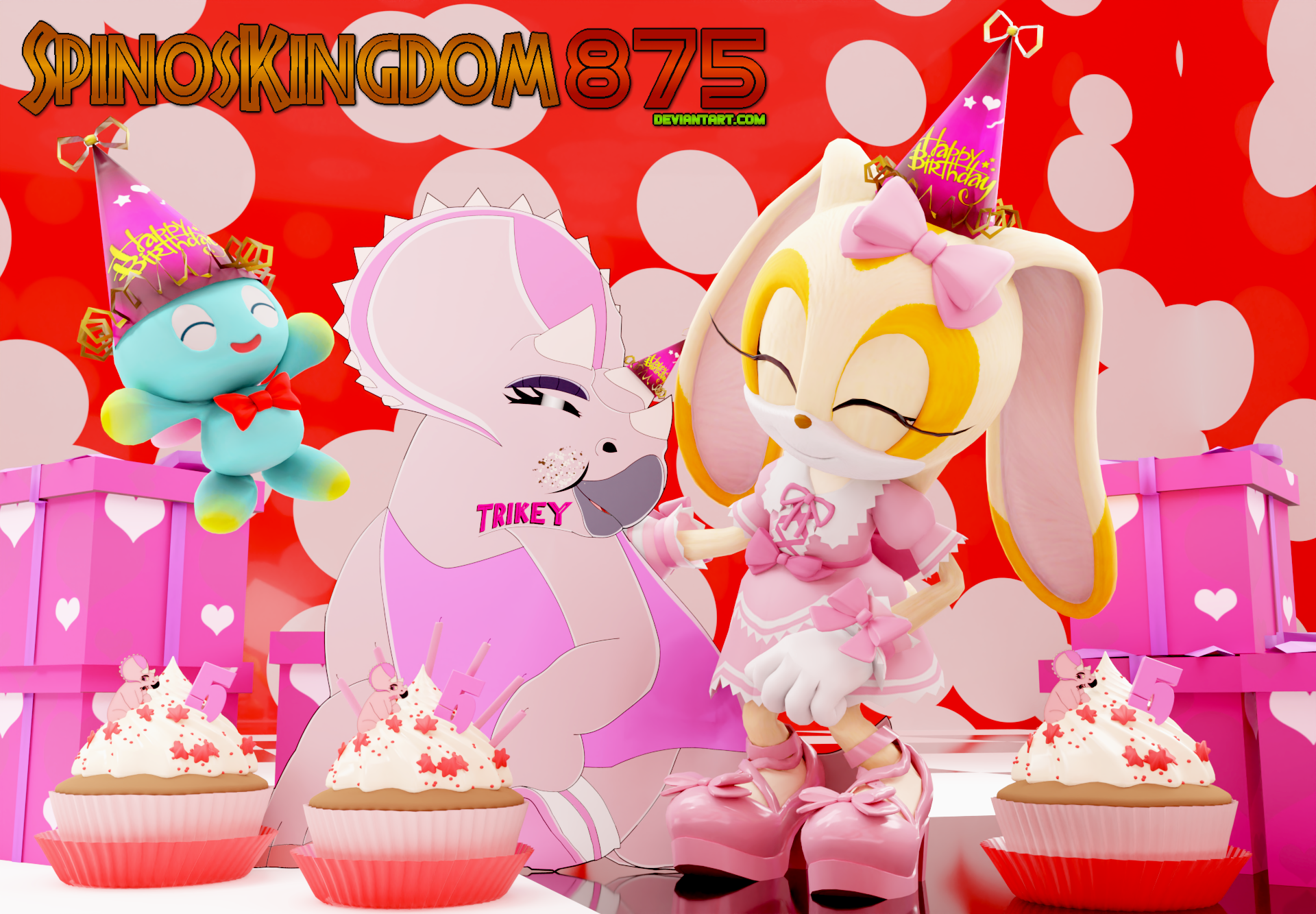 Cupcakes, and Candle: archive3d.net/Goodness, I almost forgot about another anniversary that's happening today. Today is also the 5th anniversary of my little Triceratops OC, Trikey! On November 30th, 2017, while publishing renders based on Pakistan's Sonic McDonald's commercial, One of the renders I've published was the Cream Flower Catch, featuring Cream catching flowers Cheese drops, and at the corner was a little pink Triceratops, which was Trikey's prototype. I did a test on placing 2D plane images in 3d environments. She was called baby and wasn't named until the Fallen Kingdom renders were published. And thus, Trikey was born. Cream: Alright, Trikey. Now make a wish and blow out the candles! Trikey: Okay. She closes her eyes and then blows out the five candles. Cream: Yay! Trikey: Wow, I did it! Cream: You did! Good job! Trikey digs into her cupcake. Trikey: Mmm, Yummy! Cream: Do you like it? The baby dino nodded. Cream: Good, my Mama made it. Trikey: Well, tell I said it's good. Cream: I will. And look there's even a cookie shape of you! Trikey: Ooh, I sure look tasty! Cream giggles. As she picks up her cupcake, She sighs. Cream: Can you believe it's been 5 years since we first met? Trikey: Yeah, that was a long time ago, when I was a baby! Cream: But Trikey, you are still a baby. Trikey: I know. Cream: But you are growing and learning every day. Trikey: Yeah, you're right. I am! Cream: And you'll always be a baby to us. Trikey: Aww, thank you, Cream. And thank you for the yummy cupcake! Cream: There's even a cookie shape of you! Trikey: Ooh, I sure look tasty! Cream giggles, as they enjoy their cupcakes. Happy 5th Birthday, my sweet little Triceratops! (Credits: Cream & Cheese: Sega & Sonic Team. Trikey the Triceratops: SpinosKingdom875. Logo made by ShadowNinjaMaster. (Characters: Cream: SpinosKingdom875. Cheese: FatalitySonic2, whose account has been deactivated. (Props: Party Hats: deexie. Cupcakes, and Candle: archive3d.net/0 Comments 0 Shares 136 Views -