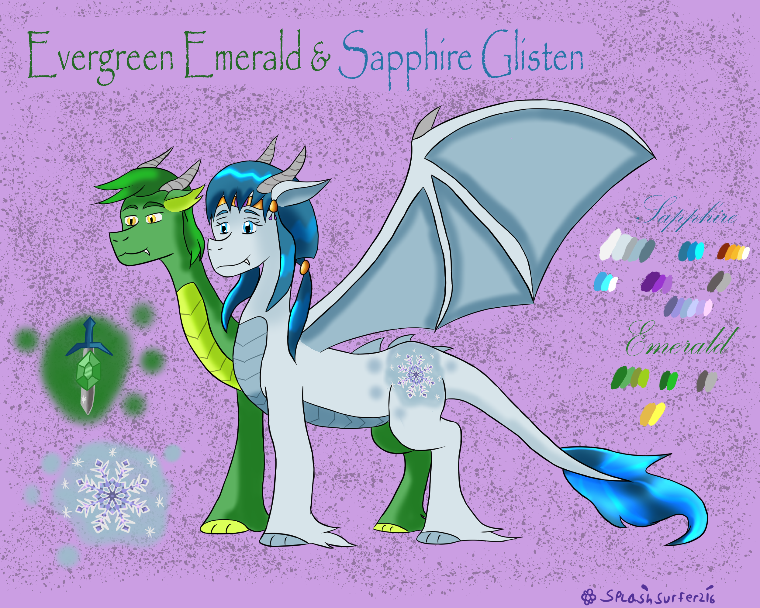 About: Emerald and Sapphire’s birth was a very painful experience for Rarity, and at first the end result frightened many who lay eyes on the creature, which slowly grew into amazement. Emerald has the agility, strength, and heart of a hero. Having been bullied alongside his sister by other foals for their appearances, Emerald took up interest in learning how to defend himself which grew into an interest in becoming a great warrior. Sapphire has similar traits to her mother. She can be snooty and a bit self-centered, but retains the generous spirit of her mother, and isn’t afraid of a little adventure as long as she doesn’t get too dirty. She is very sexually active but maintains a prim, proper and collected approach towards those she pursues though in reality deep down, she’s a real dominatrix (Which embarasses her brother since he has to come along for the ride.). She harbors romantic feelings towards Cosmo, which makes them both a target for teasing by not just her brother, but also their friends and rival suitresses. Yet Cosmo likes her all the same. Emerald and Sapphire may have their differences and tend to bicker and disagree as most siblings will do, but care for each other nevertheless and know how to work together when necessary.Name: Evergreen Emerald & Sapphire Glisten Nickname: Emerald & Glissy (Only Emerald calls her that.) Parents: Spike and Rarity Siblings: Each other (They’re twins, duh.) Species: Two-headed dragon/pony hybrid Gender: Male/Female Sexuality: Bisexual Alignment: NG Special Ability: Cryokinesis, but can breathe fire like normal dragons. Occupation: Warriors Voice Actor(s): Emerald: Tom Kenny (Spyro the Dragon) Sapphire: Jennifer Darling (Ayeka - Tenchi Muyo! Ryo Ohki) About: Emerald and Sapphire’s birth was a very painful experience for Rarity, and at first the end result frightened many who lay eyes on the creature, which slowly grew into amazement. Emerald has the agility, strength, and heart of a hero. Having been bullied alongside his sister by other foals for their appearances, Emerald took up interest in learning how to defend himself which grew into an interest in becoming a great warrior. Sapphire has similar traits to her mother. She can be snooty and a bit self-centered, but retains the generous spirit of her mother, and isn’t afraid of a little adventure as long as she doesn’t get too dirty. She is very sexually active but maintains a prim, proper and collected approach towards those she pursues though in reality deep down, she’s a real dominatrix (Which embarasses her brother since he has to come along for the ride.). She harbors romantic feelings towards Cosmo, which makes them both a target for teasing by not just her brother, but also their friends and rival suitresses. Yet Cosmo likes her all the same. Emerald and Sapphire may have their differences and tend to bicker and disagree as most siblings will do, but care for each other nevertheless and know how to work together when necessary.0 Comments 0 Shares 7 Views