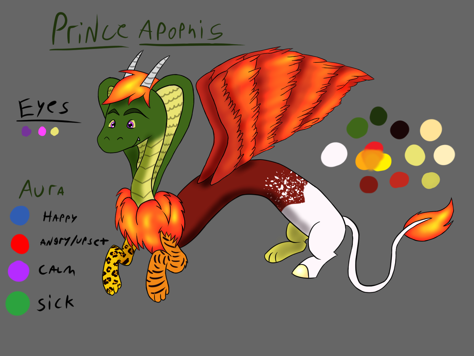 About: Apophis is a playful, chaotic spirit just like his father, and is the very first draconequus born in Equestrian history (His father was created.). Being half snake (His head’s a cobra), he is very slippery and can easily escape danger through mere wits or just a snap of his fingers, or tail. As a young foal, his powers were more unpredictable than that of a normal draconequus and were mostly linked to his emotions, (e.i throwing a tantrum would cause a raging storm that creates strong winds and flooding while happiness such as laughing spread joy.) but as he matured he gained more control of his magic. Being separated from his parents while still an infant, like the other kids, he has very few memories of them, one being of the lullabies his parents would sing to calm him down after a chaotic meltdown, and the toy his stepmother, gave him at his birth, Glo-Breezie, which he is greatly attached to. Having heard stories about Discord before the Storm of Shadows flooded Equestria, Apophis aspires to live up to his father’s legacy as the God of Chaos.Name: Apophis Nickname: None Parents: King Discord and Queen Celestia, Fluttershy (Stepmother) Species: Draconequus Gender: Male Sexuality: Straight Alignment: NG Special Ability: Reality bending and can travel via whirlwind Occupation: Next in line as king of Equestria Cutie Mark: Whirlwind Voice Actor: Cameron Clarke (Kingdom Hearts 2 - Simba) About: Apophis is a playful, chaotic spirit just like his father, and is the very first draconequus born in Equestrian history (His father was created.). Being half snake (His head’s a cobra), he is very slippery and can easily escape danger through mere wits or just a snap of his fingers, or tail. As a young foal, his powers were more unpredictable than that of a normal draconequus and were mostly linked to his emotions, (e.i throwing a tantrum would cause a raging storm that creates strong winds and flooding while happiness such as laughing spread joy.) but as he matured he gained more control of his magic. Being separated from his parents while still an infant, like the other kids, he has very few memories of them, one being of the lullabies his parents would sing to calm him down after a chaotic meltdown, and the toy his stepmother, gave him at his birth, Glo-Breezie, which he is greatly attached to. Having heard stories about Discord before the Storm of Shadows flooded Equestria, Apophis aspires to live up to his father’s legacy as the God of Chaos.0 Comments 0 Shares 9 Views -