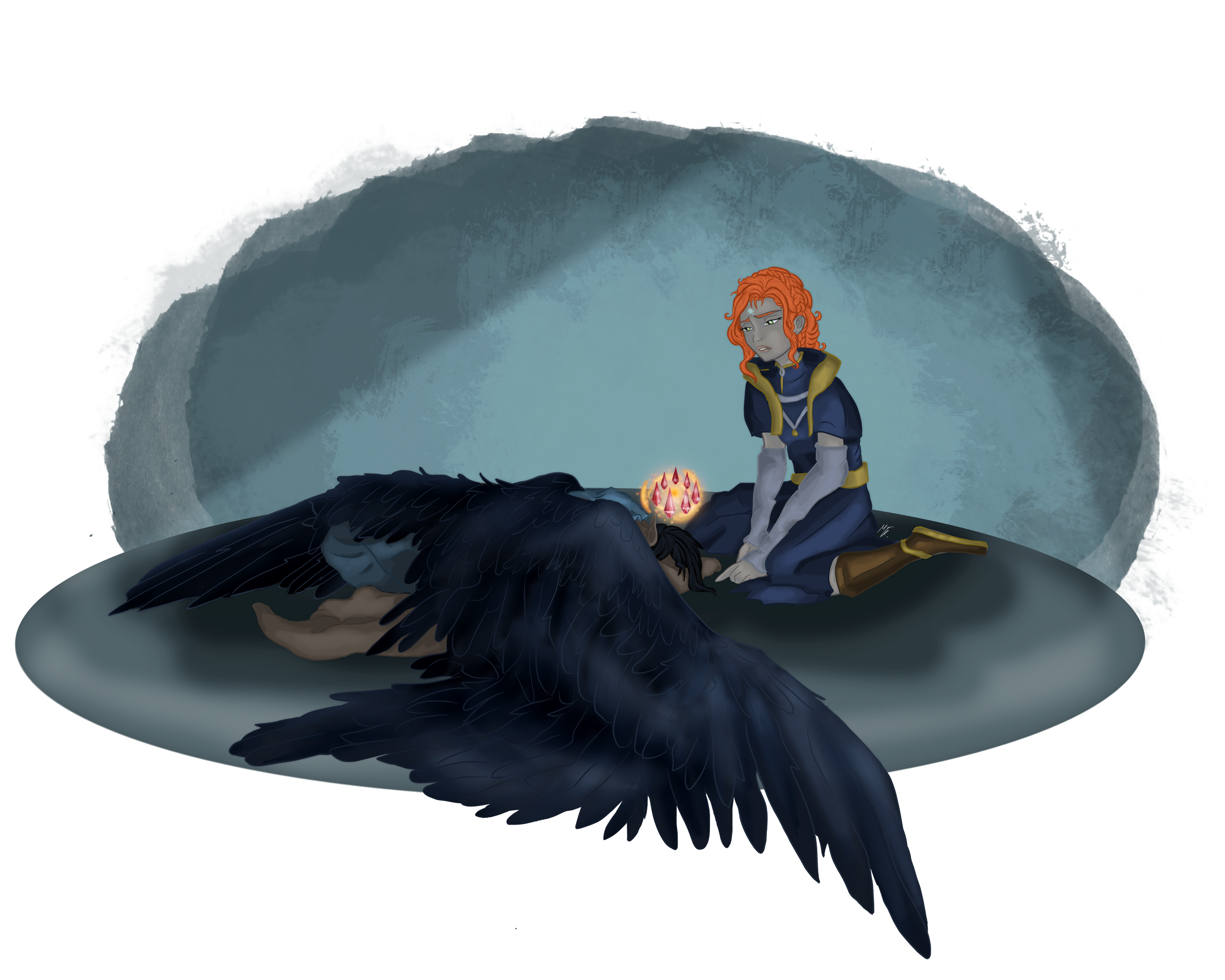 Personal workSnippets from the roleplaying scene, written in the (German) RP forum "Celcia - a world of fantasy": Corax created himself a robe of black feathers, a cloak of sorrow. Only when it almost completely covered his stature and spread like the wings of a gigantic raven over the ground and came to rest there did the growth stop. The gray prankster whimpered softly, still with his head down. Above it floated a wreath of ruby drops like blood-red tears, the crown of the mourner. He reached out his hand until it touched Azura. "Please ... don't leave me alone..." My (npc) OC Corax and his love Azura (which is kind of undead at the moment, that's why her skin isn't ... fresh). I loved that scene I had to draw it. Personal work0 Comments 0 Shares 23 Views -