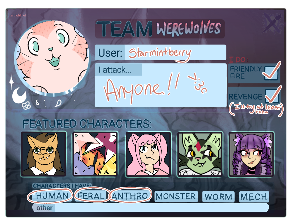 I'm on Team Werewolves this year! Honestly hard to pick between the two teams, I just have a lot of pals on Vampires. I don't discriminate though, I'm here to draw art and have fun! I'll attack you no matter WHAT TEAM YOU'RE ON! >:3c
