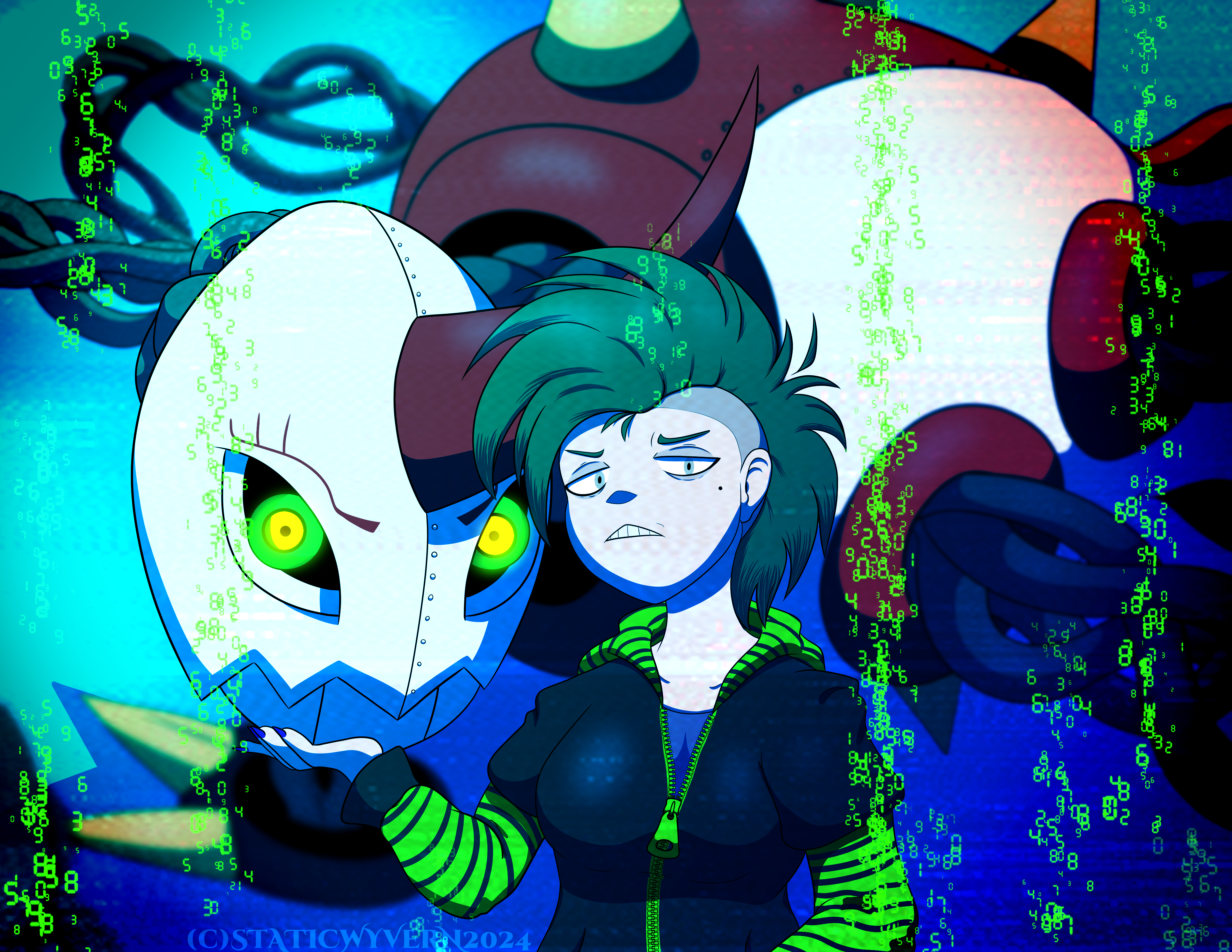 Made this out of excitement because my DM is planning on running a Digimon campaign for the lot of us, had to draw myself with my boy (albeit all grown up)! Need a big robot spider with a gun in his mouth to keep me safe <3