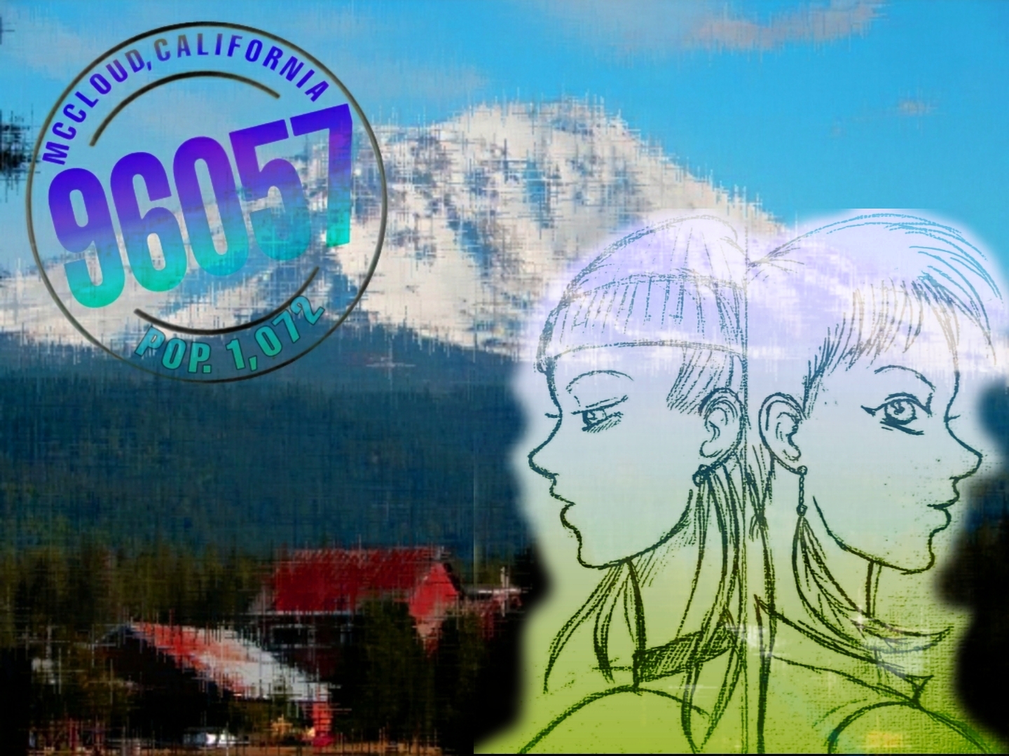 Using the original sketch of the twins, Vaughn and Skye Robin Stillwater and drawing inspiration from the 90's Beverly Hills 90210 logo (Helvetica font if you please), I used the backdrop of Mount Shasta in the McCloud area of Northern California.