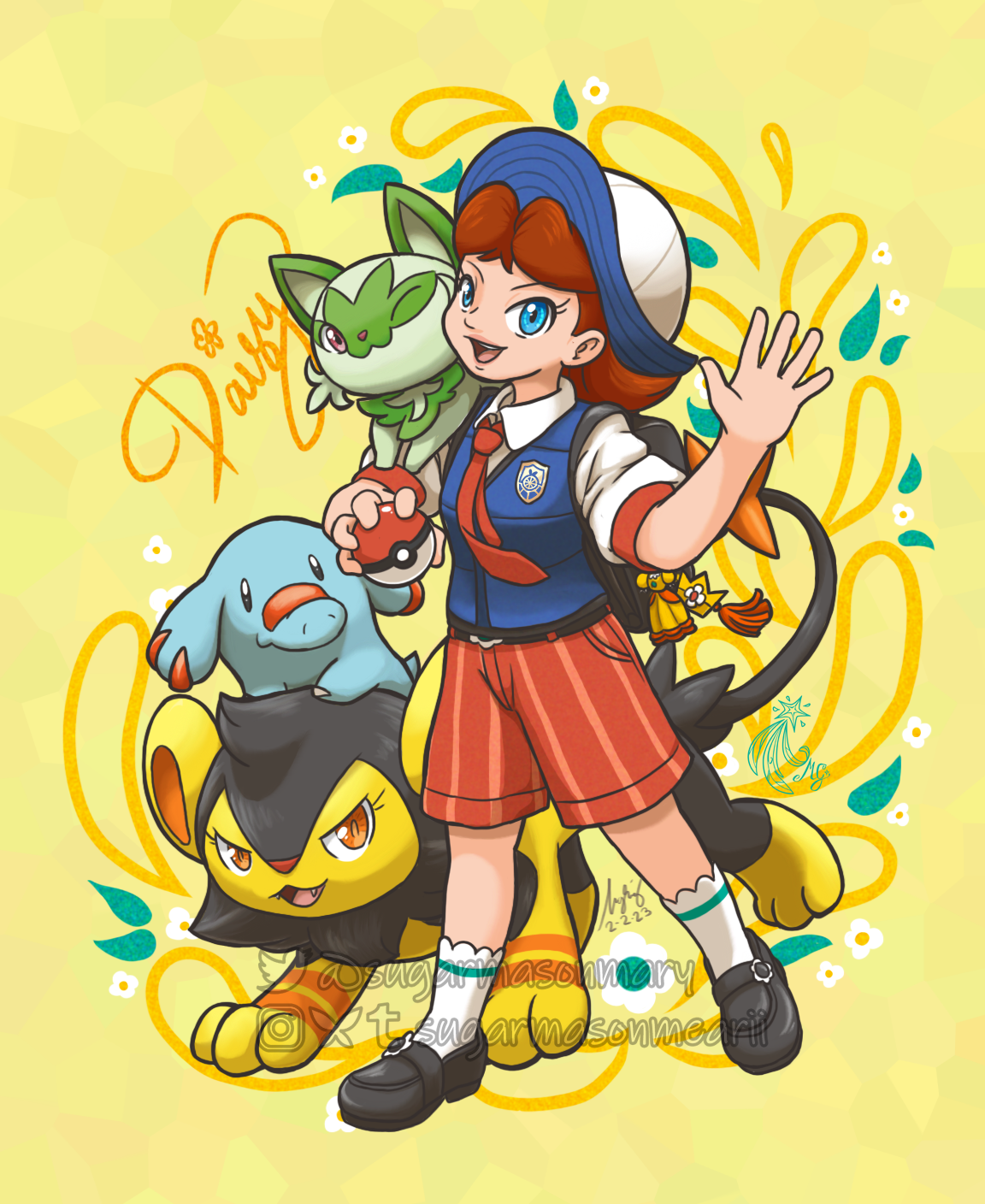 Super Mario (c) Nintendo✨ Check out my other media: [[Carrd]](https://meariiportfolio.carrd.co/) [[Linktree]](https://linktr.ee/sugarmasonmearii) ✨ Interested in my art? Check out my [[Commission Shop!]](https://sugarmasonmearii.carrd.co/) ✨ Support me on [[Ko-Fi!]](https://ko-fi.com/sugarmasonmearii) --- A short, fun drawing of my favorite Mario Princess, with my favorite electric feline in her shininess, a Phanpy and of course Sprigatito. I picked the Naranja Autumn uniform for her, and tweaked it a bit by curtailing the sleeves to her elbows, as well as changing the socks to match her Daisy-ness. Now if you're wondering why the Phanpy is because of the desert affinity, and Phanpy's Ground type. Sprigatito's an obvious choice for being grass-type and a Paldean Starter. Shiny Luxio, don't have to ask :> --- Pokemon: (c) Game Freak, Nintendo and Creatures Super Mario (c) Nintendo0 Comments 0 Shares 0 Views -