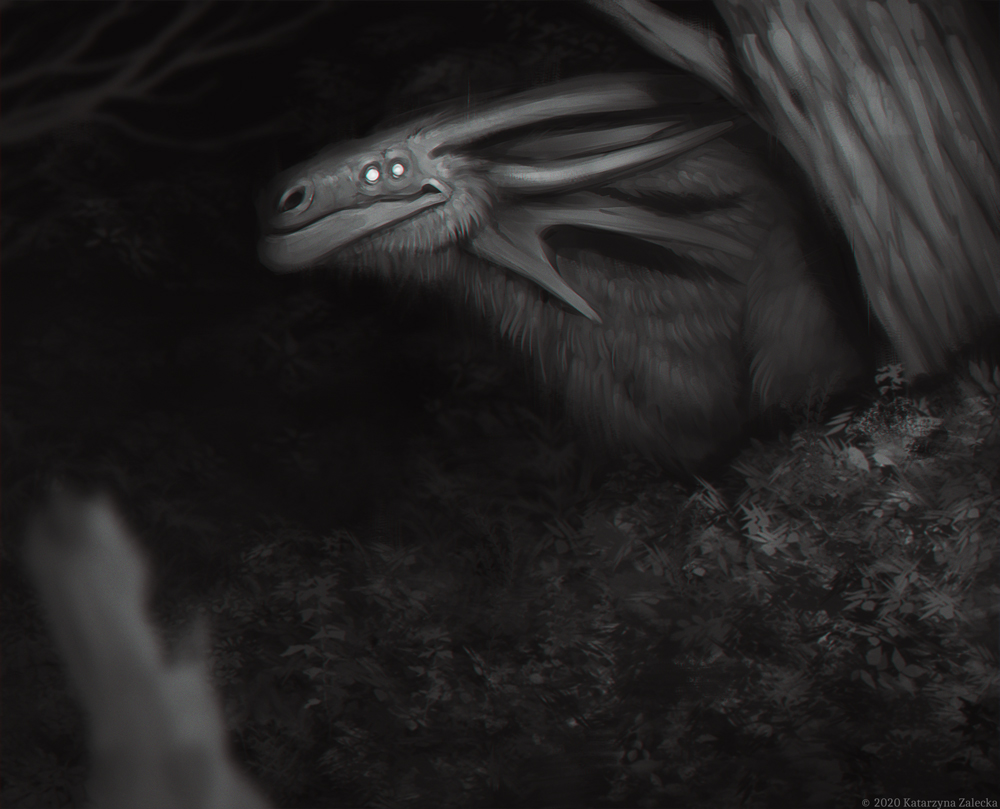 I wanted to try one of those night vision drawings for a while. It ended up quite fun as I have an easier time working with greyscale/monochrome and will probably do more in the future. Although it might seem scary, with their size you'd probably hear a nyfrit in the woods long before you saw it.