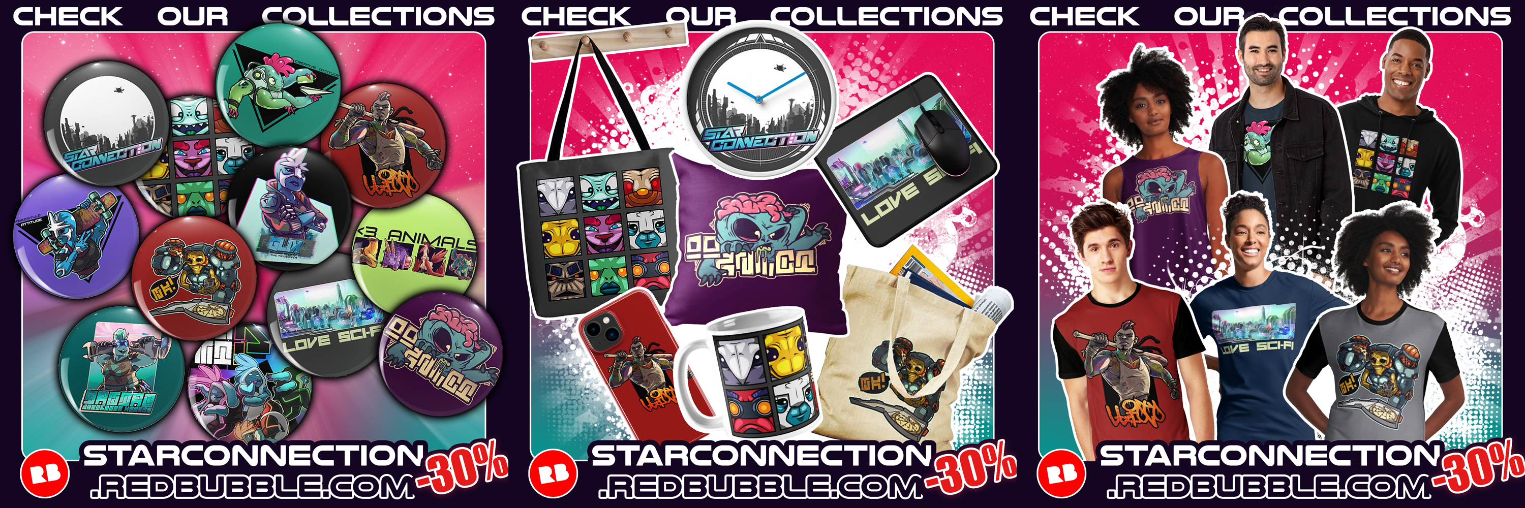 Check our [RedBubble store](https://www.redbubble.com/people/starconnection/shop) and find your thing :)All is said ^^ If you want to get nice Star Connection t-shirts, sweats, badges, stickers, clocks, mugs, pillows... we have several designs for you a lots of ways to wear it or decorate your home ! Aliens, environments, creatures, smiling faces, badass boy, blue skater-girl, 4-armed zombi, pizza meccha... Check our [RedBubble store](https://www.redbubble.com/people/starconnection/shop) and find your thing :)0 Comments 0 Shares 65 Views -
