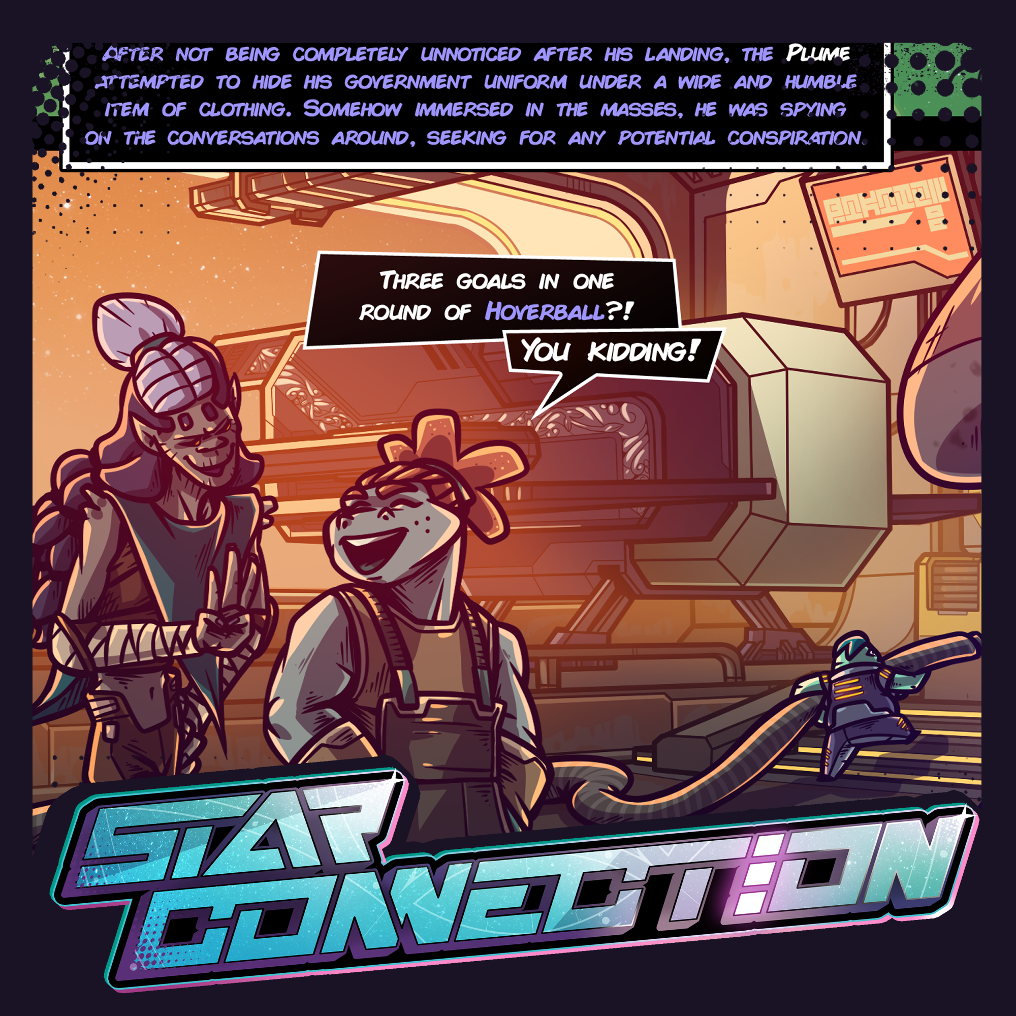 -> Read our comics for free on [Tapastic](tapas.io/series/Star-Connection)While Egol is landing his Olovif spaceship on the Kampo space station hangar, two hybrides discuss about the latest Hoverball match. -> Read our comics for free on [Tapastic](tapas.io/series/Star-Connection)0 Comments 0 Shares 42 Views -