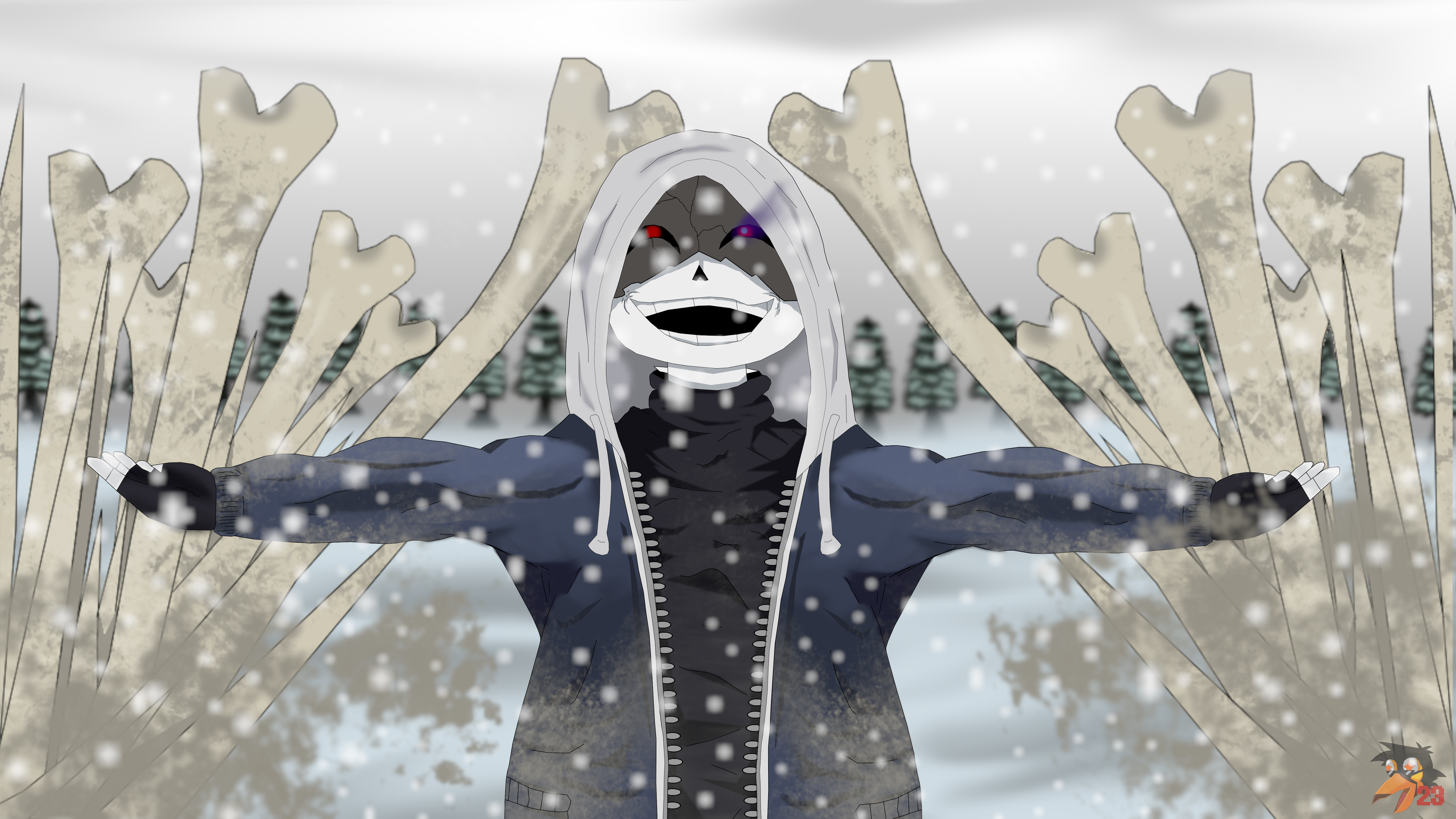 So i tried stepping outside of my comfort zone and began practicing drawing backgrounds to my art. When I showed some of the WIP's to my friends they genuinely liked them. Infact one person suggested that I put happy little treees to which I did lol In context it makes more sense because now it shows that sans is killing other monsters in Snowdin forest. The mask on sans's face is supposed to represent symbolisim. Its really not hard to figure out as all you have to do is connect the dots.