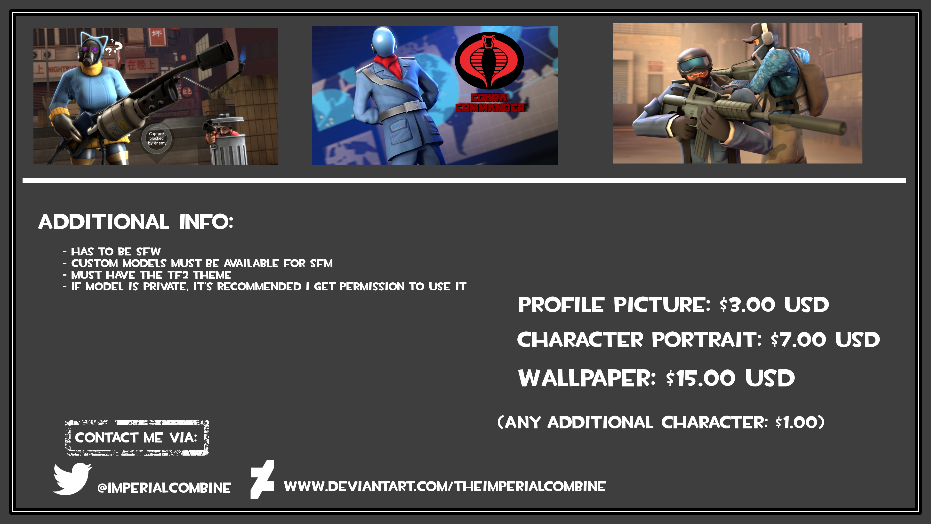 Hi There, I'm starting to do Commissions for SFM again, if you or anyone you know is interested feel free to contact me and we'll work something out.Hi There, I'm starting to do Commissions for SFM again, if you or anyone you know is interested feel free to contact me and we'll work something out.0 Comments 0 Shares 5 Views
