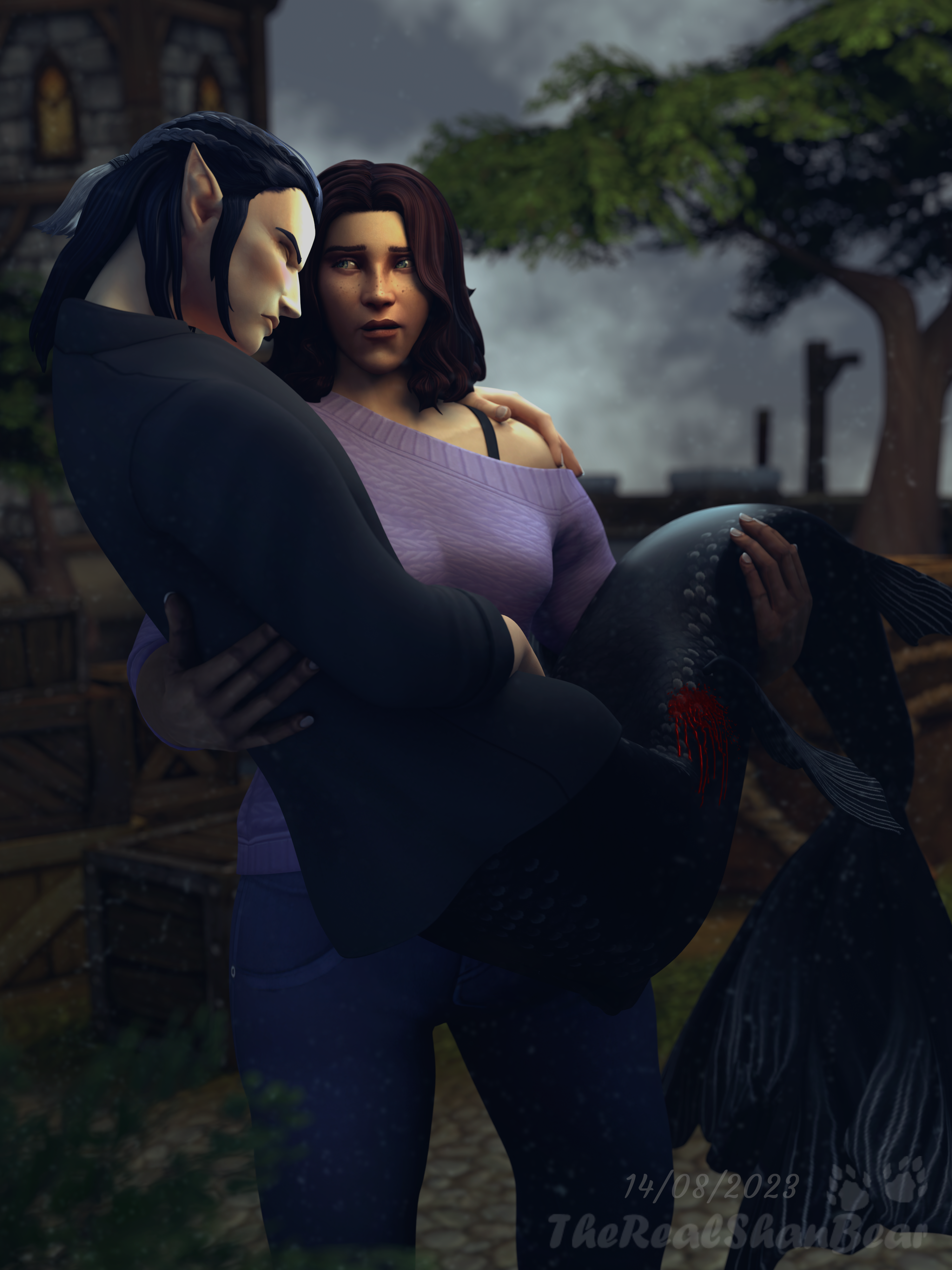 WoW assets © Blizzard Entertainment. Characters of Shanhalla and Gilnoruil belong to me.I started writing some vague scenes between Halla and Merman Gilnoruil (I was thinking of doing a whole fic but that's beyond me at the moment) and one of them was Gilnor getting captured by a madman bent on proving the existence of Merfolk. He ended up needing to use his siren powers to save Halla from the guy, and to do that, he had to transform. But he was weakened, and that meant he had nothing left after the baddie was incapacitated and couldn't change back. So Halla had to carry him out and get him back to the sea - luckily, she's pretty strong! Of course in the ficlet, she covers his tail up first so no-one will see it, but for art purposes, I wanted it visible. I told a good friend of mine about this and she was eager to see it depicted, so this one is dedicated to her for being awesome =D The Mer-tail is a Sims 4 custom creation by DanSimsFantasy. Clothing from The Sims 4. WoW assets © Blizzard Entertainment. Characters of Shanhalla and Gilnoruil belong to me.0 Comments 0 Shares 14 Views -