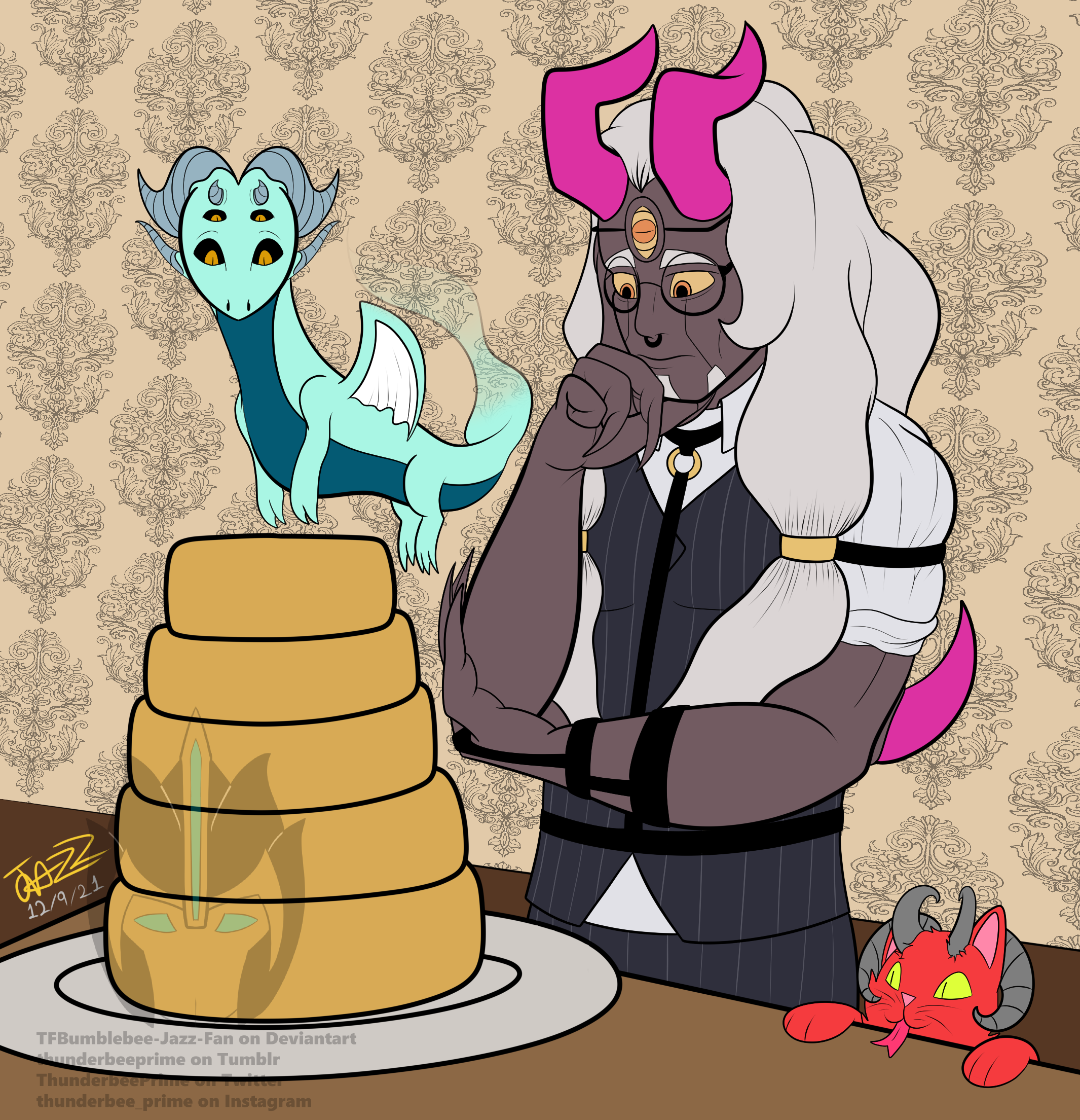 This was for a game of "Draw The OC Above" in a Discord server and I had a blast drawing this OC and it was the first time I tried to make a background. He's a baker, so I thought it would be fitting having him think about what kind of decorations he should use on the cake while his pets watch
