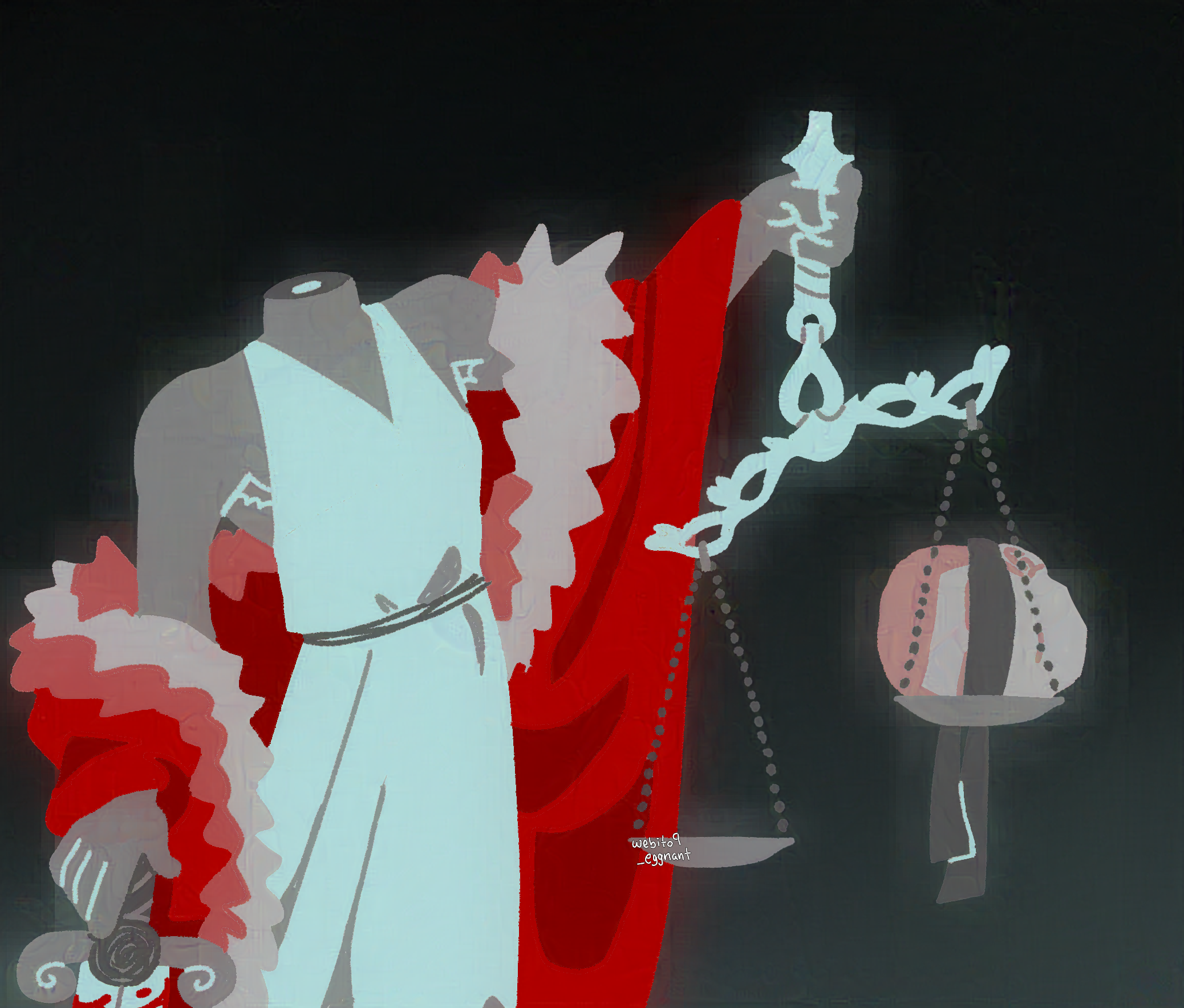 [ID: a lineless colored digital sketch that resembles Lady Justice. Ashley, my character, appears with a white tunic, holding a bloodied sword with his right hand and scales with her left. She is decapitated, a little bit of the bones in his neck showing. His tunic, skin, sword and scales are in greyscale. He is also wearing Moeder's, another one of my characters, red royal robes. It is also noticeable that Moeder's head, also colored in red/pink hues, is in one of the scales, blindfolded with a gray cloth. The scale without Moeder's head, which is empty, is tipped. The whole image has a green/blue overlay, and the background is a black to green/blue gradient. End ID.][ID: a lineless colored digital sketch that resembles Lady Justice. Ashley, my character, appears with a white tunic, holding a bloodied sword with his right hand and scales with her left. She is decapitated, a little bit of the bones in his neck showing. His tunic, skin, sword and scales are in greyscale. He is also wearing Moeder's, another one of my characters, red royal robes. It is also noticeable that Moeder's head, also colored in red/pink hues, is in one of the scales, blindfolded with a gray cloth. The scale without Moeder's head, which is empty, is tipped. The whole image has a green/blue overlay, and the background is a black to green/blue gradient. End ID.]0 Comments 0 Shares 44 Views