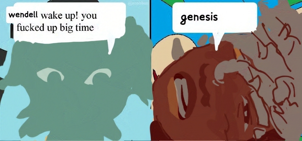 ID: A two-panel comic of two of my characters. In the leftmost panel, Genesis, a ghost whose appearance is just a blue silhouette, says while looking down: "Wendell, wake up! You fucked up big time". In the right-most panel, a closeup of a groggy Wendell's face can be seen lying on the ground. Wendell is a black person with white short locs and brown/hazelnut heterochromatic eyes. He is squinting as they say Genesis' name. End ID.ID: A two-panel comic of two of my characters. In the leftmost panel, Genesis, a ghost whose appearance is just a blue silhouette, says while looking down: "Wendell, wake up! You fucked up big time". In the right-most panel, a closeup of a groggy Wendell's face can be seen lying on the ground. Wendell is a black person with white short locs and brown/hazelnut heterochromatic eyes. He is squinting as they say Genesis' name. End ID.0 Comments 0 Shares 43 Views