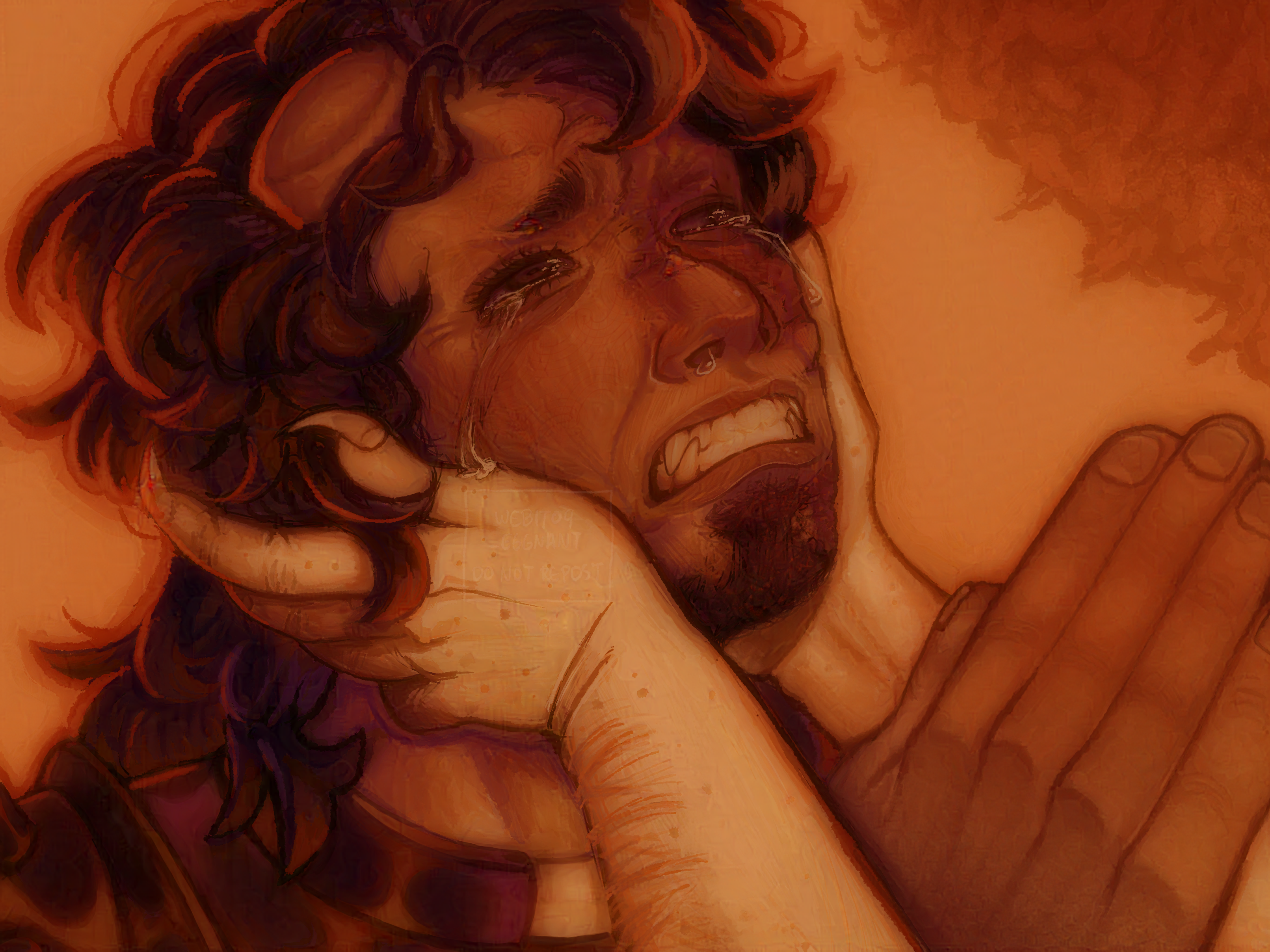 [ID: A digital illustration of two of our characters, Vértigo and Vermillion. Only Vermillion's red hair and slim hands are visible, while Vértigos bust can be seen, as well as his right, and only, hand, up in prayer. Vértigo is a tan caucasian, and has the left side of its face burnt off, his short beard intact. His wavy, brown hair goes down to their shoulders, a cut-off part of one of his horns seeping through his scalp. It is also wearing his characteristic shiny, black armor. The fingers that are caressing it have long, sharp nails, but none of them bring him any harm. Vermillion is holding Vértigo's face with both hands as he painfully sobs, looking up to them. The background is a bright peach, and the piece has a peach overlay. End ID][ID: A digital illustration of two of our characters, Vértigo and Vermillion. Only Vermillion's red hair and slim hands are visible, while Vértigos bust can be seen, as well as his right, and only, hand, up in prayer. Vértigo is a tan caucasian, and has the left side of its face burnt off, his short beard intact. His wavy, brown hair goes down to their shoulders, a cut-off part of one of his horns seeping through his scalp. It is also wearing his characteristic shiny, black armor. The fingers that are caressing it have long, sharp nails, but none of them bring him any harm. Vermillion is holding Vértigo's face with both hands as he painfully sobs, looking up to them. The background is a bright peach, and the piece has a peach overlay. End ID]0 Comments 0 Shares 86 Views