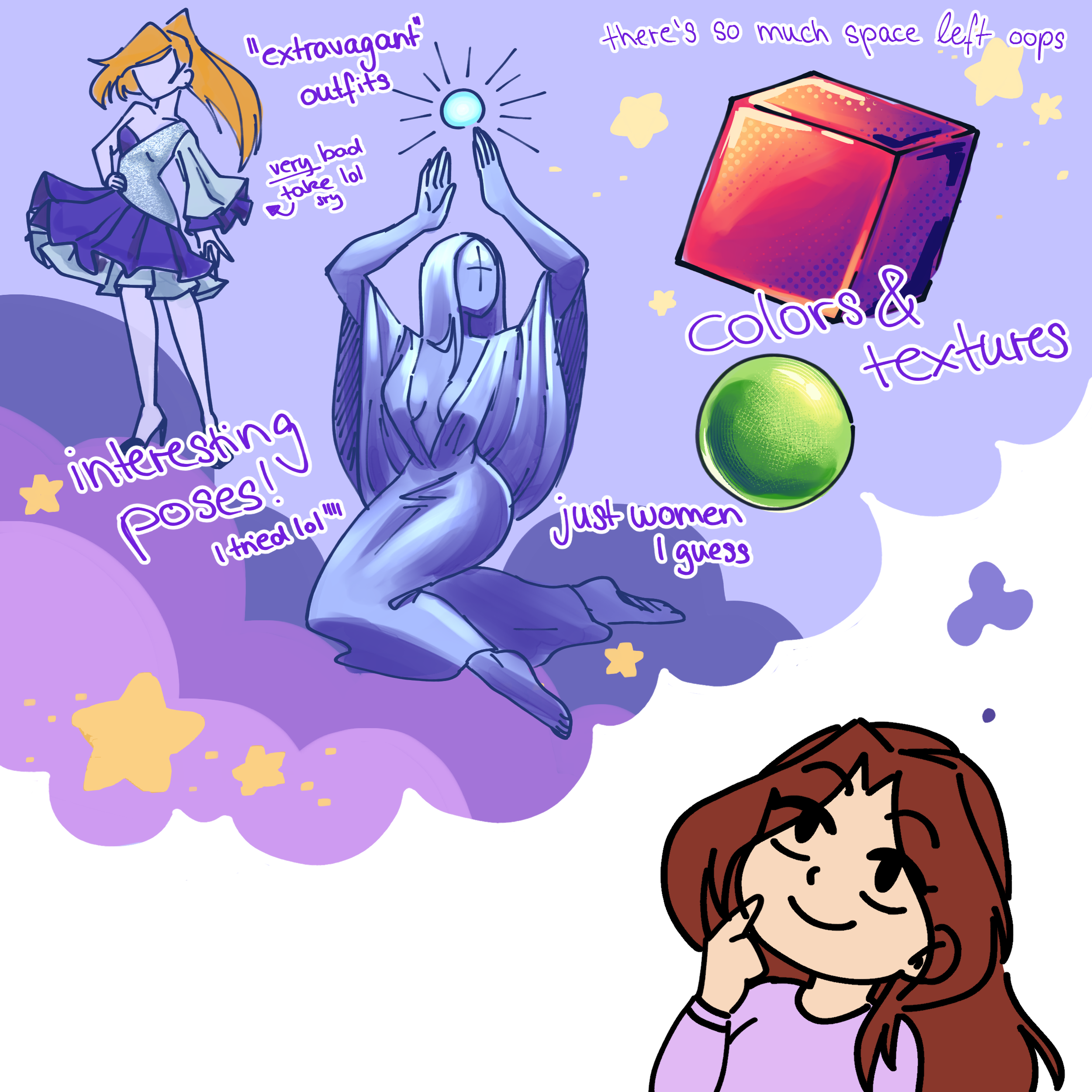 My fav things to draw are girls, stars and sparkles, BIG eyes and shiny hair! shiny anything tbh oops