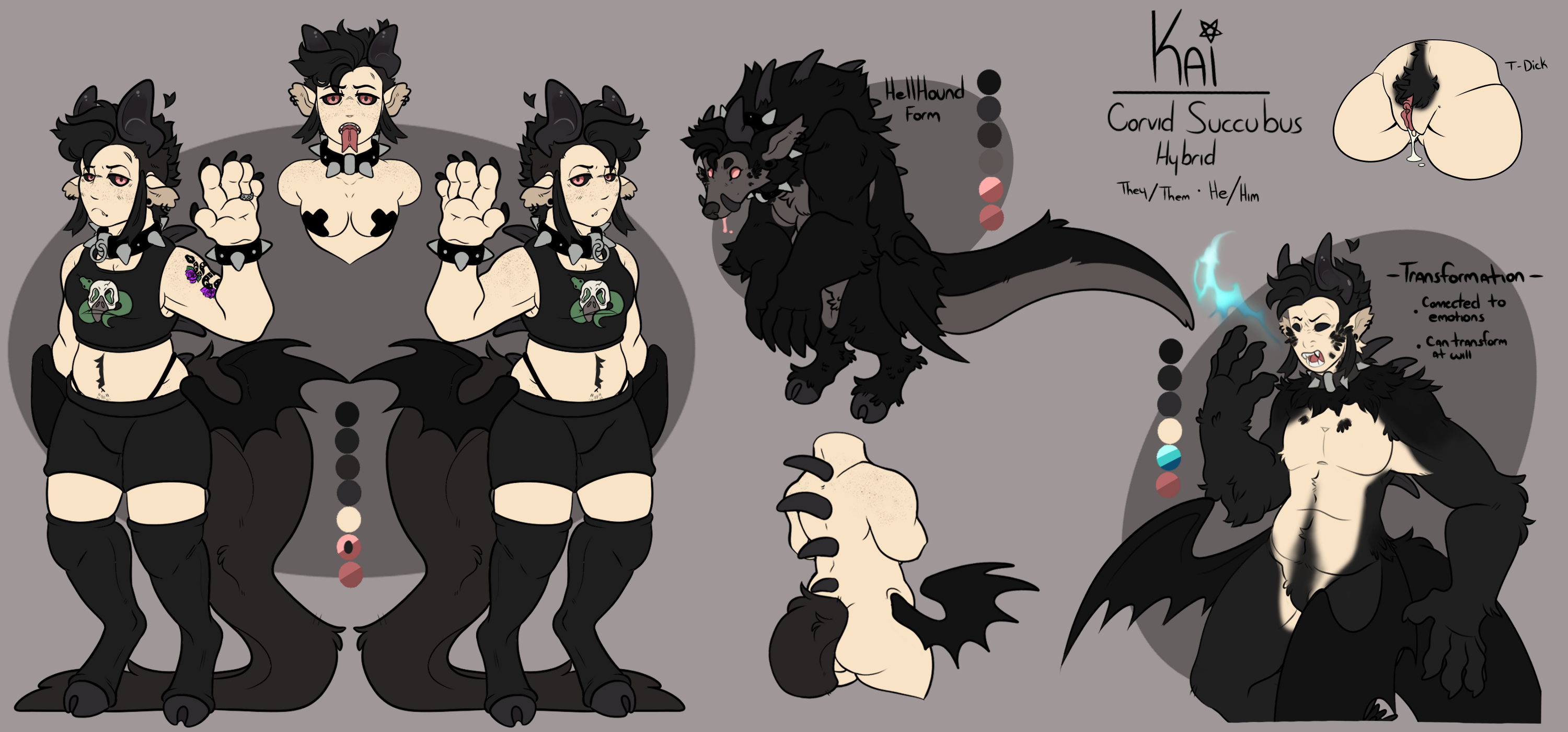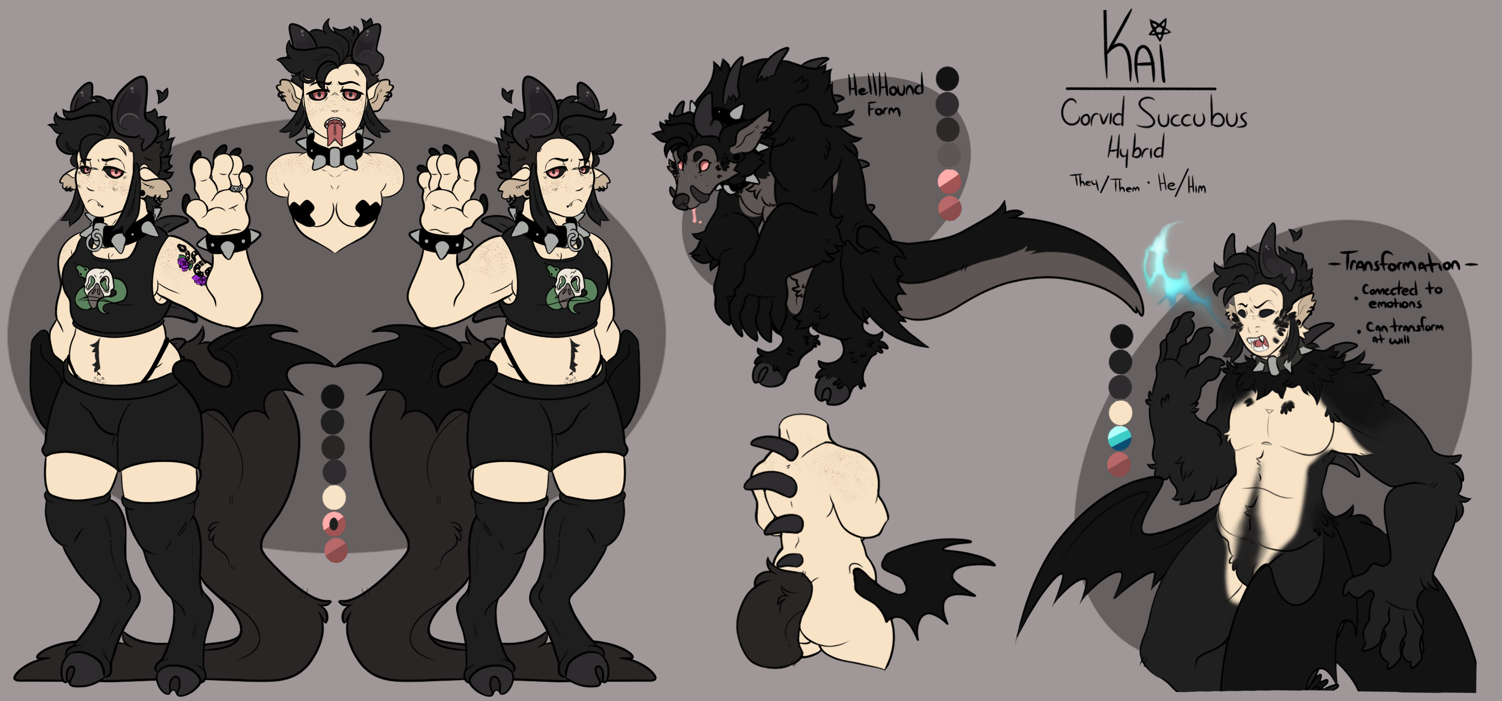 They are a succubus corvid hybrid with shapeshifting abilities, one of his main forms is a hellhound!Finally made a ref of my main persona Kai They are a succubus corvid hybrid with shapeshifting abilities, one of his main forms is a hellhound!0 Comments 0 Shares 25 Views -
