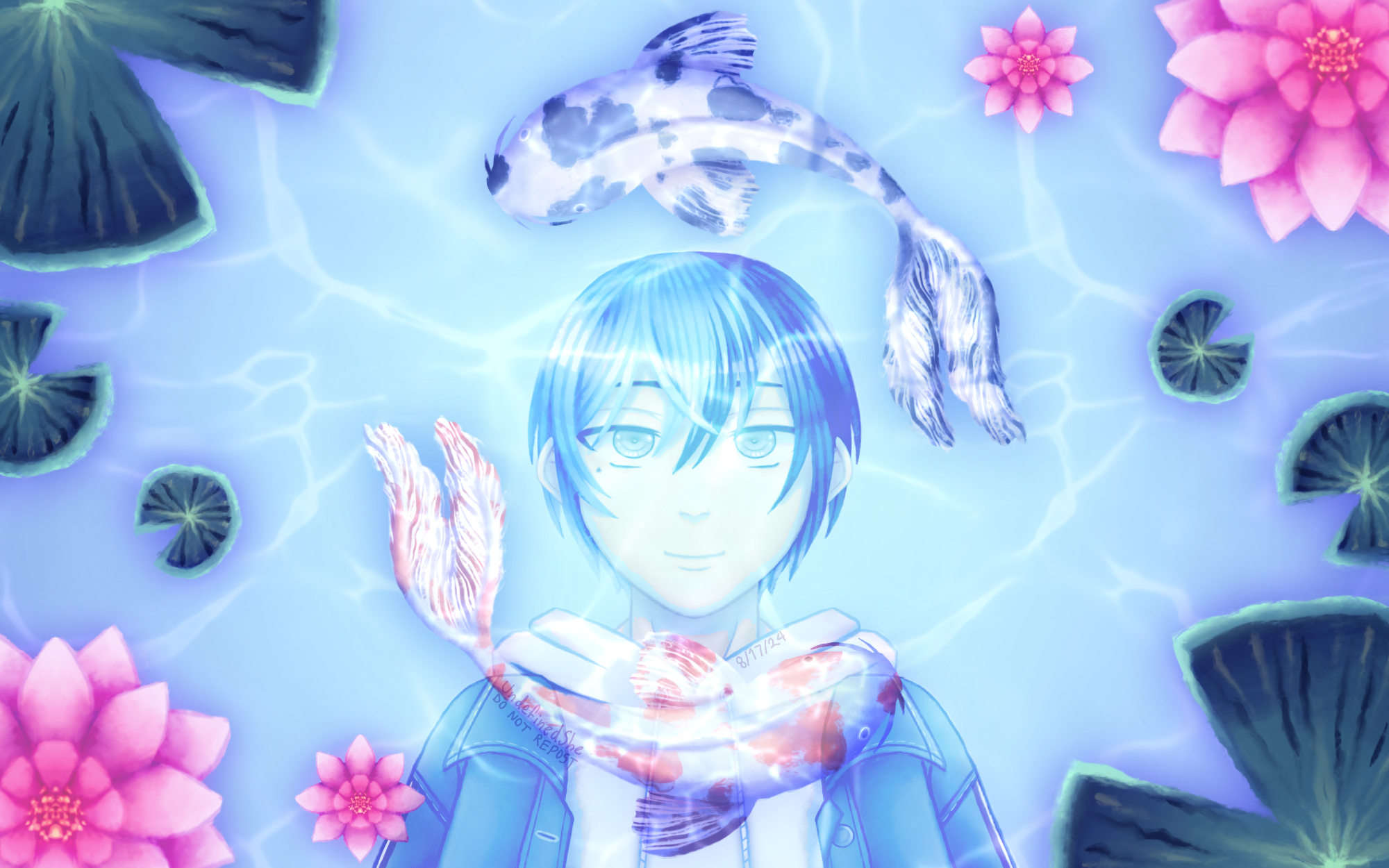 Here's a drawing I made of Toya Aoyagi from Project Sekai! I forgot what inspired this drawing, but I remember that the two koi fish are supposed to represent Toya and his singing partner, Akito. Koi represent perseverance, courage, and good luck, but they can also symbolize friendship and love (from what I can recall). I've never done a drawing with a reflection before, so this was a fun exercise!
