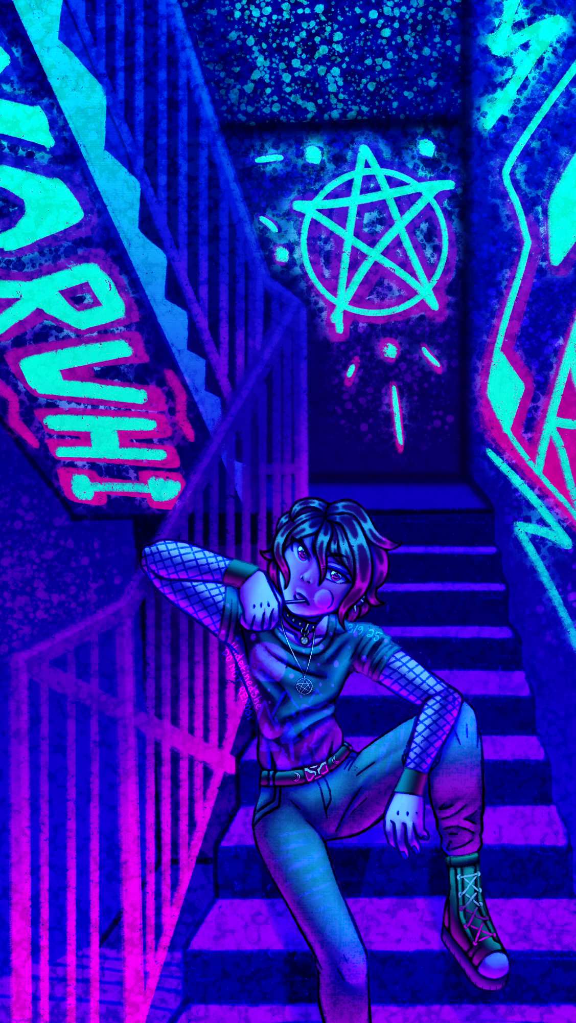 Speedpaint: https://youtu.be/VwcUCe6zaQMHere's a drawing I made of my OC, Yoruhi! They've slowly become one of my favorites among my characters because they're so cool looking :,). Their name means night and day, which can also be interpreted as twilight. I love Yoruhi's clothes since I also have an animal howling at the moon shirt, but it's just a screaming opossum replacing the wolf, LOL. To put their personality in a nutshell, they're like that one vine, "I don't need friends, they disappoint me," haha. I decided to draw Yoruhi in a stairwell with a blacklight effect and glowing graffiti since I've been obsessing over dual lighting in my artwork. I also wanted to practice different area-related backgrounds, so this was a fun exercise! Speedpaint: https://youtu.be/VwcUCe6zaQM0 Comments 0 Shares 20 Views -