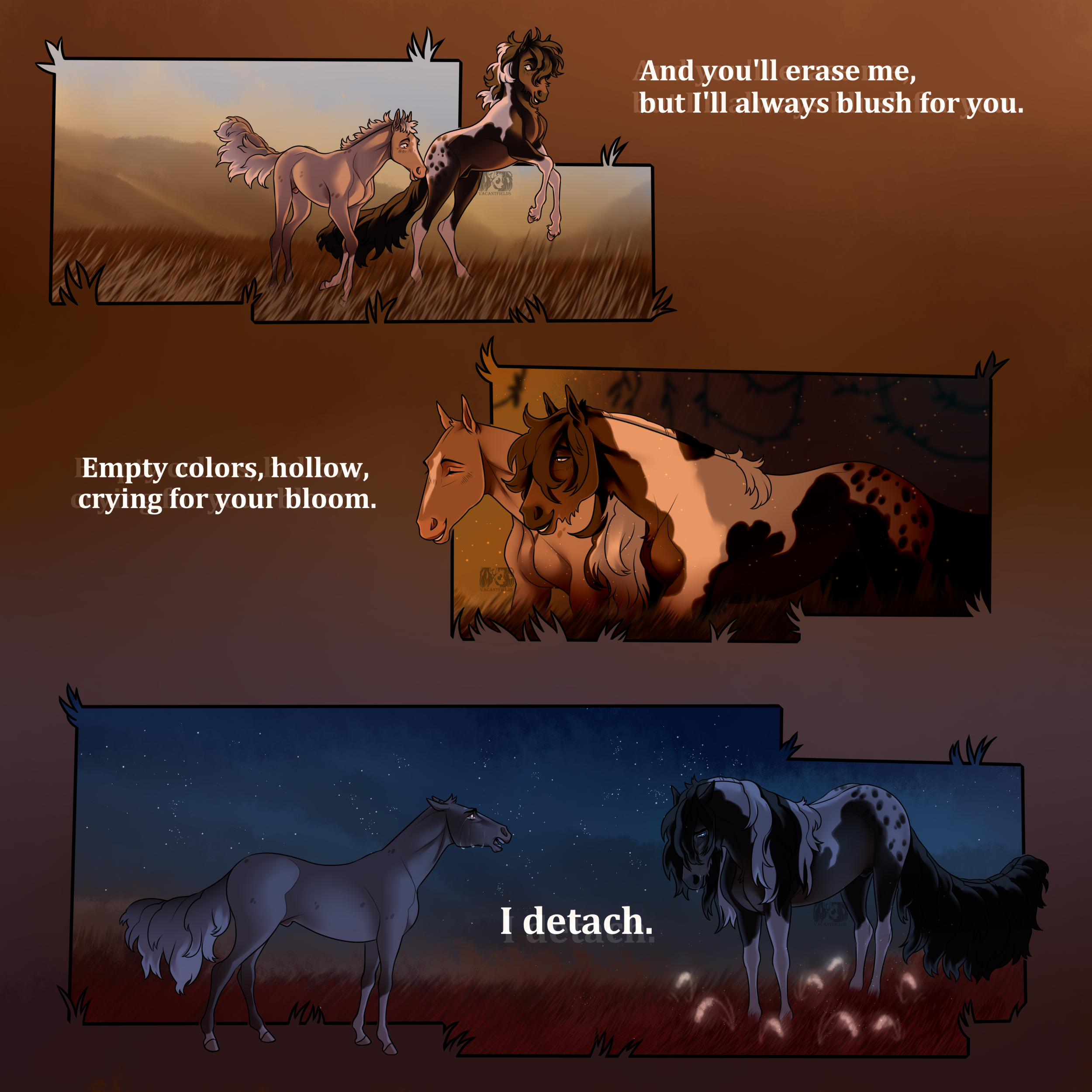Art & Ghost [c] vacantfieldsThe sun was setting. He knew this would be the last sun he would remember. His breathing was shallow, and the flowers that followed him were mocking. "You destroyed your chance; there's no chance. You burned." The flower sang in his head. "This is it." Art & Ghost [c] vacantfields0 Comments 0 Shares 4 Views -