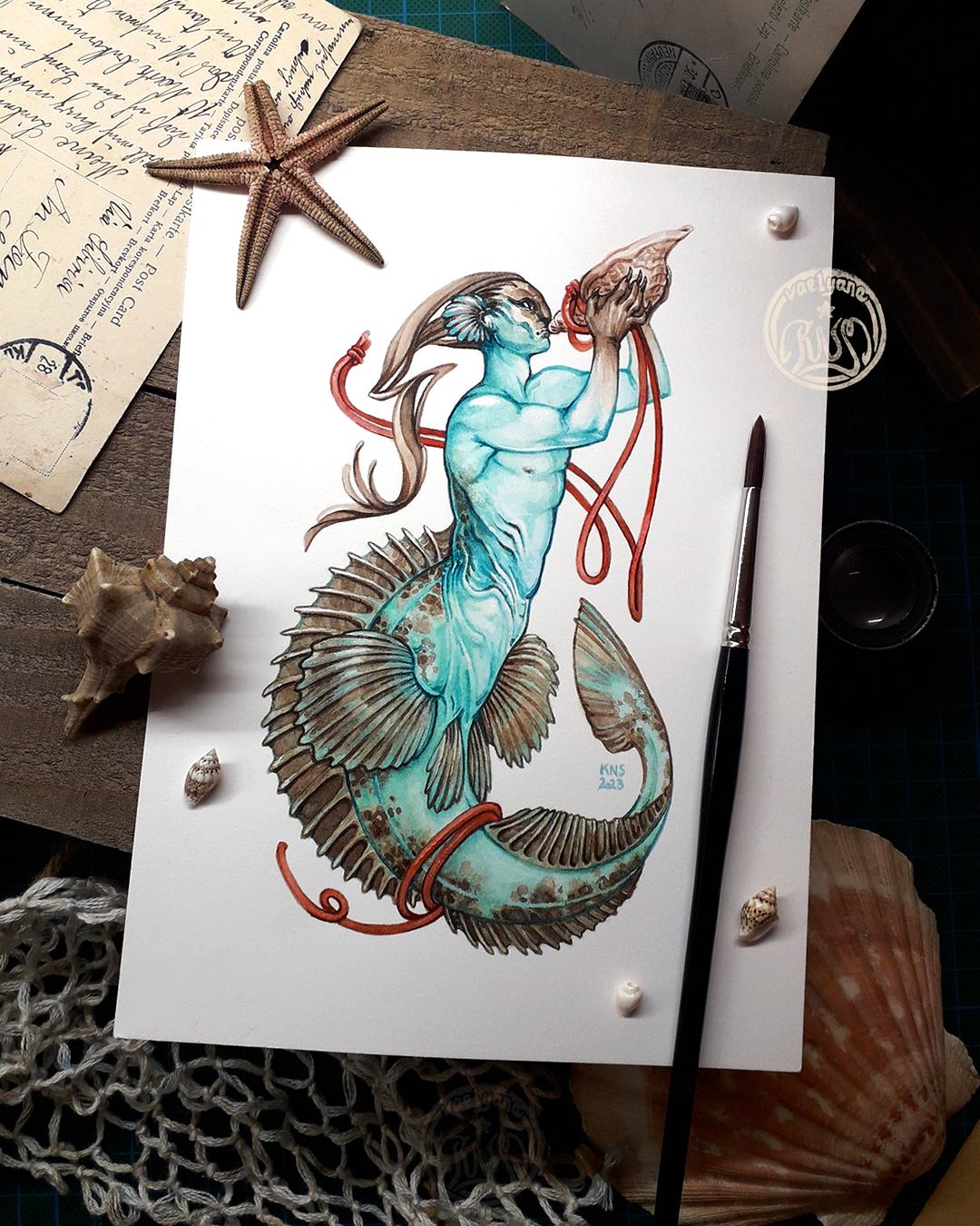 I was fiddling with my page's palette, and thought I'd upload something befitting the colour scheme I chose! I love teal. This was a character test painting of a merman based on a blue lingcod, in preparation for a larger watercolour piece. Said larger piece is featured in the [Fathoms Mermay Zine, currently available on Ko-fi until the 26th of June.](https://ko-fi.com/s/e9efa51925)