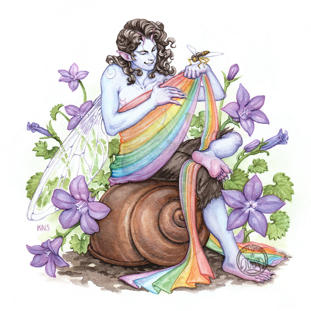 Before Pride Month is over, I suppose I should share my watercolour piece for the occasion! My piece for this year is a trans faerie, trying on a long rainbow cloth amidst the bellflowers in my garden. I hope you'll like him and his pet hoverfly!