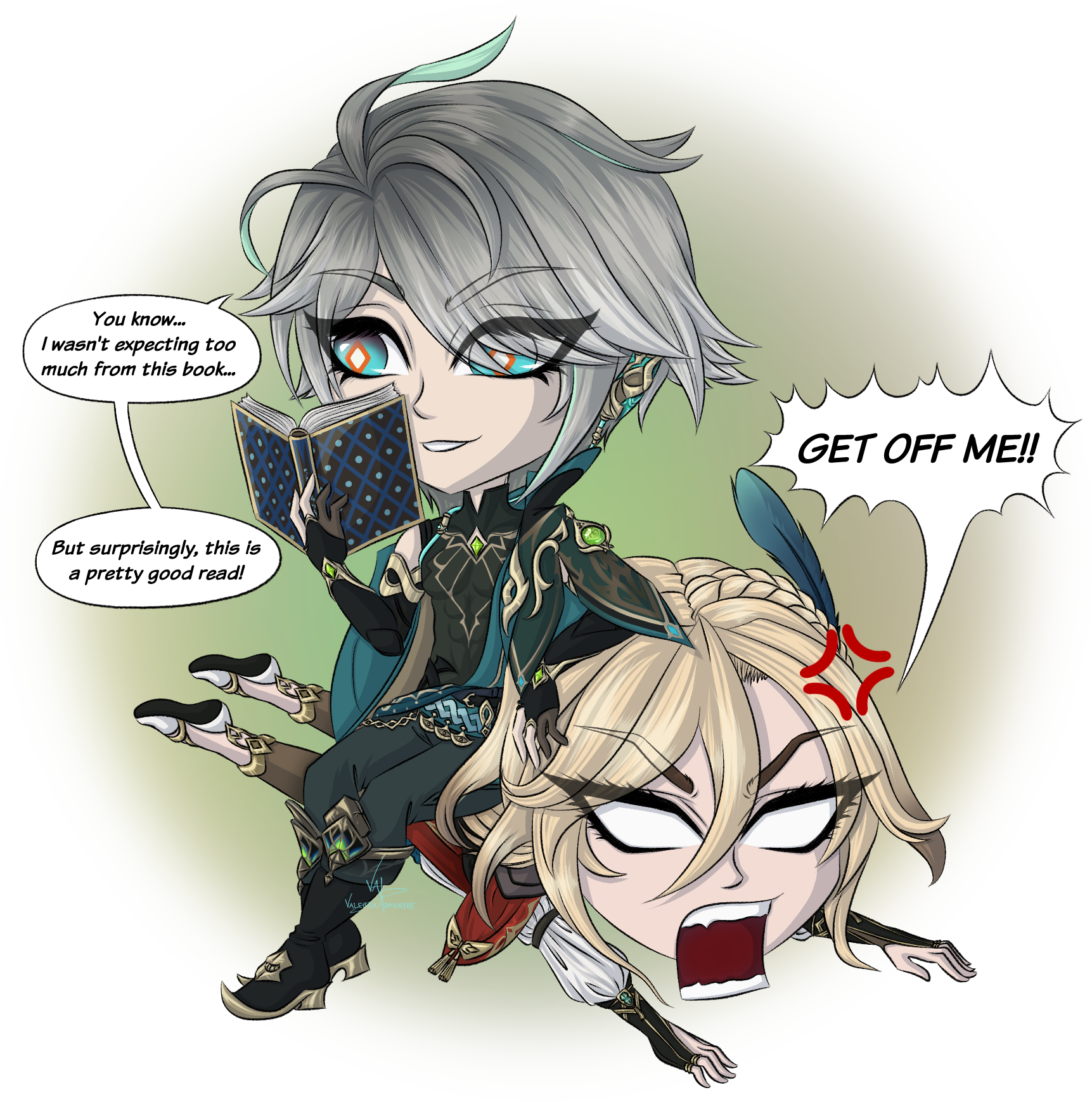 ~~What's this?? A fan art? And it's CHIBI fan art!? Uhh... yeah X'D I had a funny idea that Alhaitham would read a book, but use Kaveh as a seat... possibly as revenge for Kaveh taking Alhaitham's books or something? Idk, I just thought of the drawing concept and ended it there lmao I just knew I had to make a fan art of my all-time favorite Genshin Impact character... and there's gonna be another on the way that will be spicy... and obviously not chibi XDDDD This shit's a one-off unless I think of other comical scenes or I get commissioned to do it ~~ Alhaitham and Kaveh (c) Mihoyo Art (c) ValeriaAbsinthe ~~ Please respect me as the artist and don't trace, copy, reupload, edit, or otherwise tamper with my art without my public written permission! Thank you. ~~0 Comments 0 Shares 30 Views -