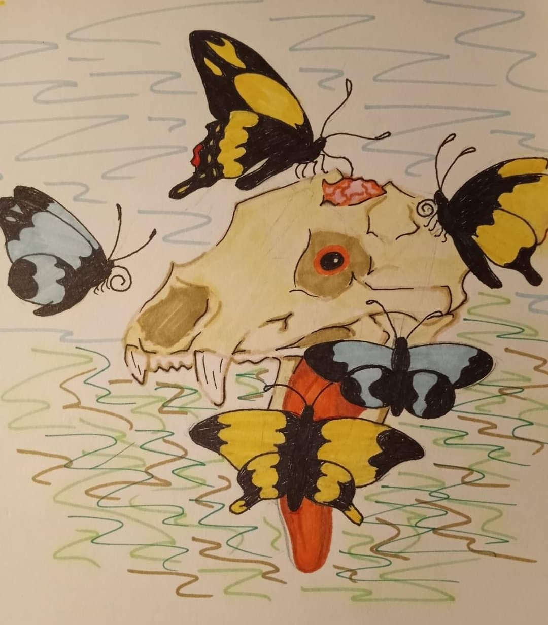 it's a decaying bear skull with butterflies feeding on the remains because at the time i had recently learned that not only do butterflies pollinate flowers by sitting on them to sip up their nectar, but they also find other sources of nutrients in meat and sweat! ^-^