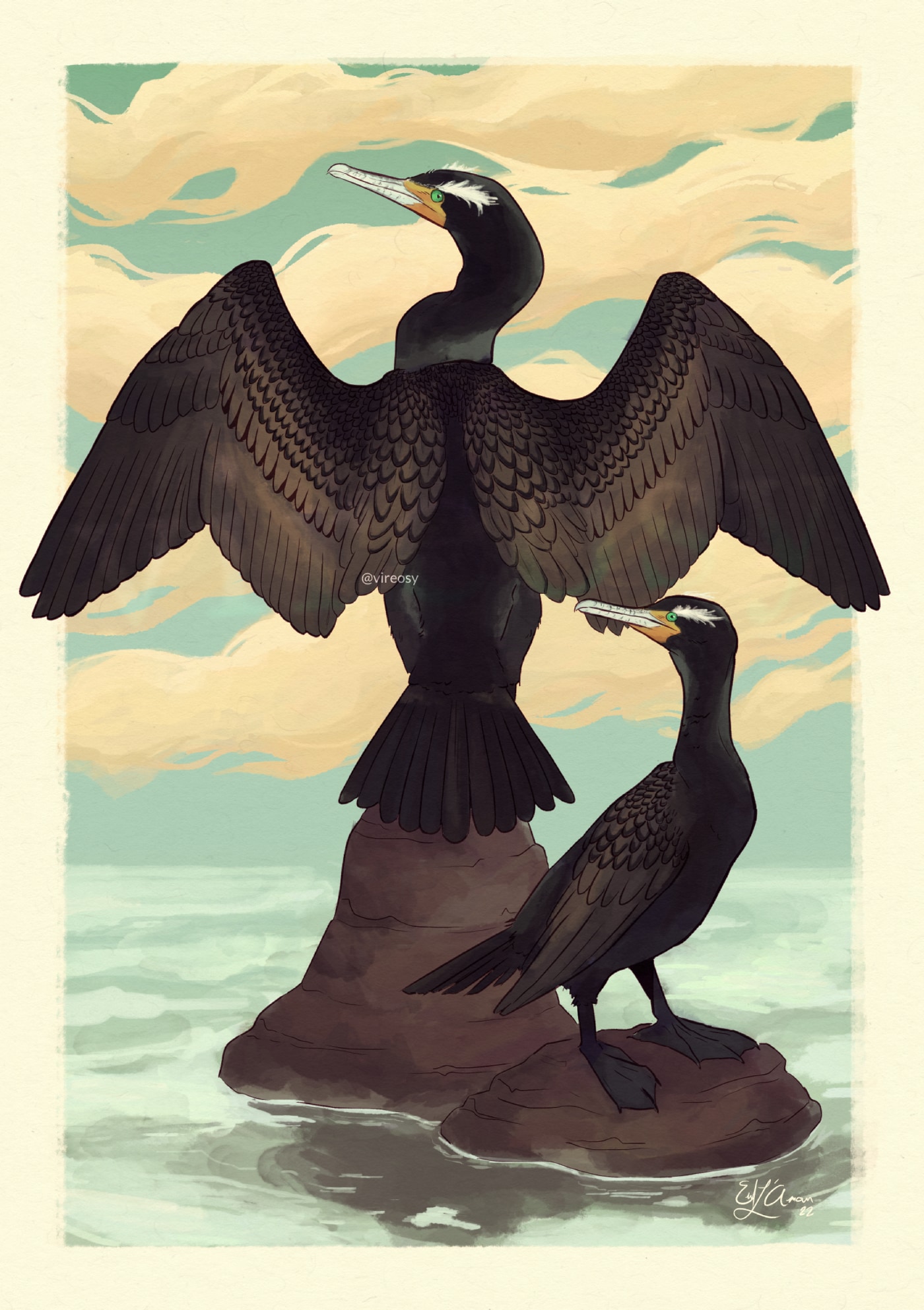 This piece is on Inprnt: www.inprnt.com/gallery/vireosy/double-crested-cormorantA pair of cormorants drawn for Sea Unseen, a marine art anthology benefitting the Australian Marine Conservation Society (2022 May). These double-crested cormorant (_Nannopterum auritum_) are in breeding plumage—the characteristic white feathers that give them their name. Cormorants are frequently seen holding their wings out in this manner to aid in drying their feathers. This is a personal favourite piece of mine. This piece is on Inprnt: www.inprnt.com/gallery/vireosy/double-crested-cormorant0 Comments 0 Shares 8 Views -