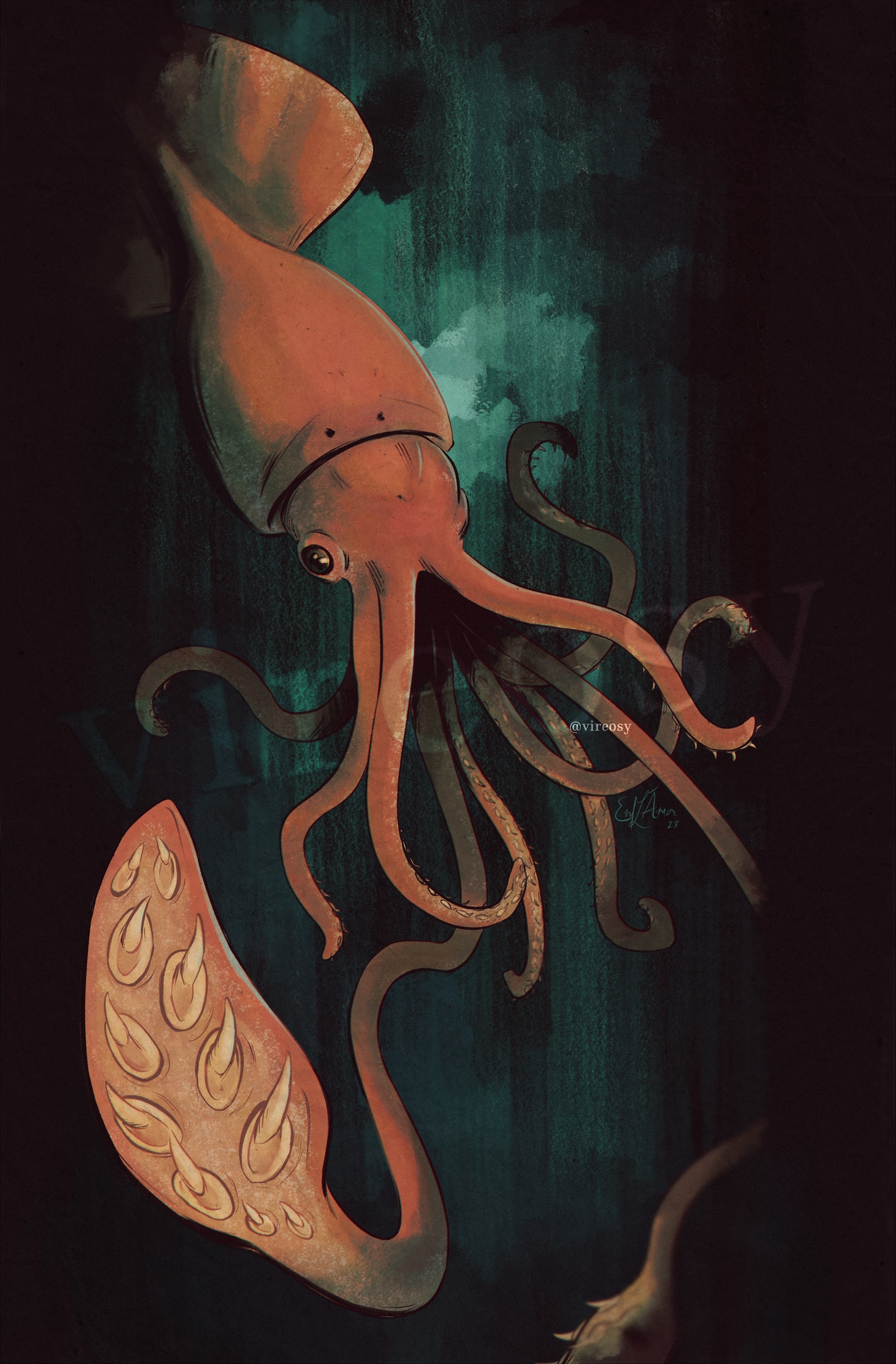 This piece is on Inprnt: https://www.inprnt.com/gallery/vireosy/colossal-squid/Colossal squid drawn for Polar Lights (2023 March) The colossal squid (_Mesonychoteuthis hamiltoni_) is a rarely seen and relatively unknown cephalopod inhabiting the depths of the Southern Ocean. Like its cousin the giant squid, colossal squid exhibit abyssal gigantism, though the colossal squid is the heavier of the two. It is also the only squid in the family Cranchiidae to have hooks equipped on its arms and tentacles. This piece is on Inprnt: https://www.inprnt.com/gallery/vireosy/colossal-squid/0 Comments 0 Shares 9 Views -