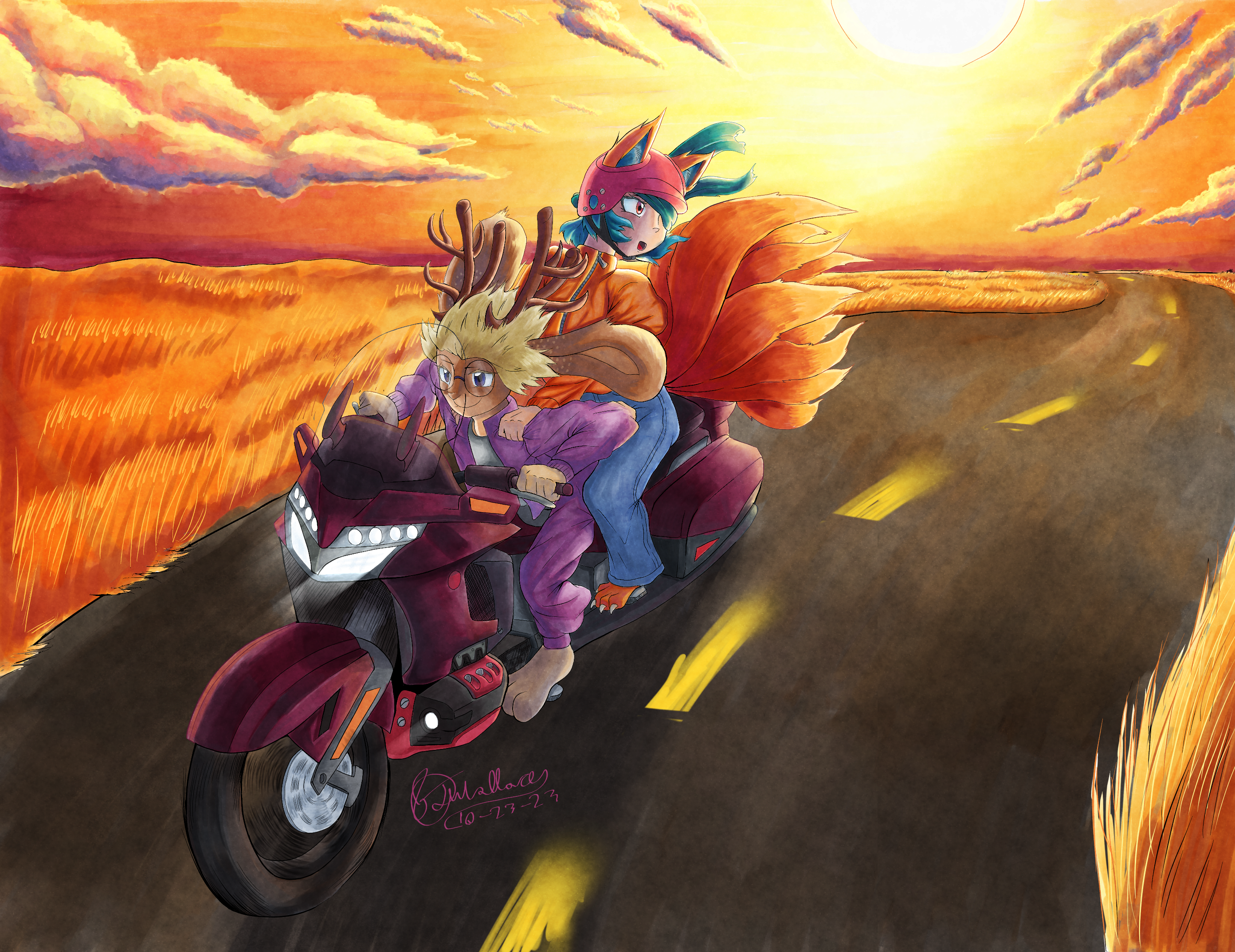 The characters do not belong to me.A commission I got on Discord from a guy for someone's Birthday! It was pretty late though due to the timing... Thankfully he enjoyed it though. It's his character Maxwell, with the other guy's character Asami on a Honda Gold Wing riding down the road! The characters do not belong to me.0 Comments 0 Shares 11 Views -