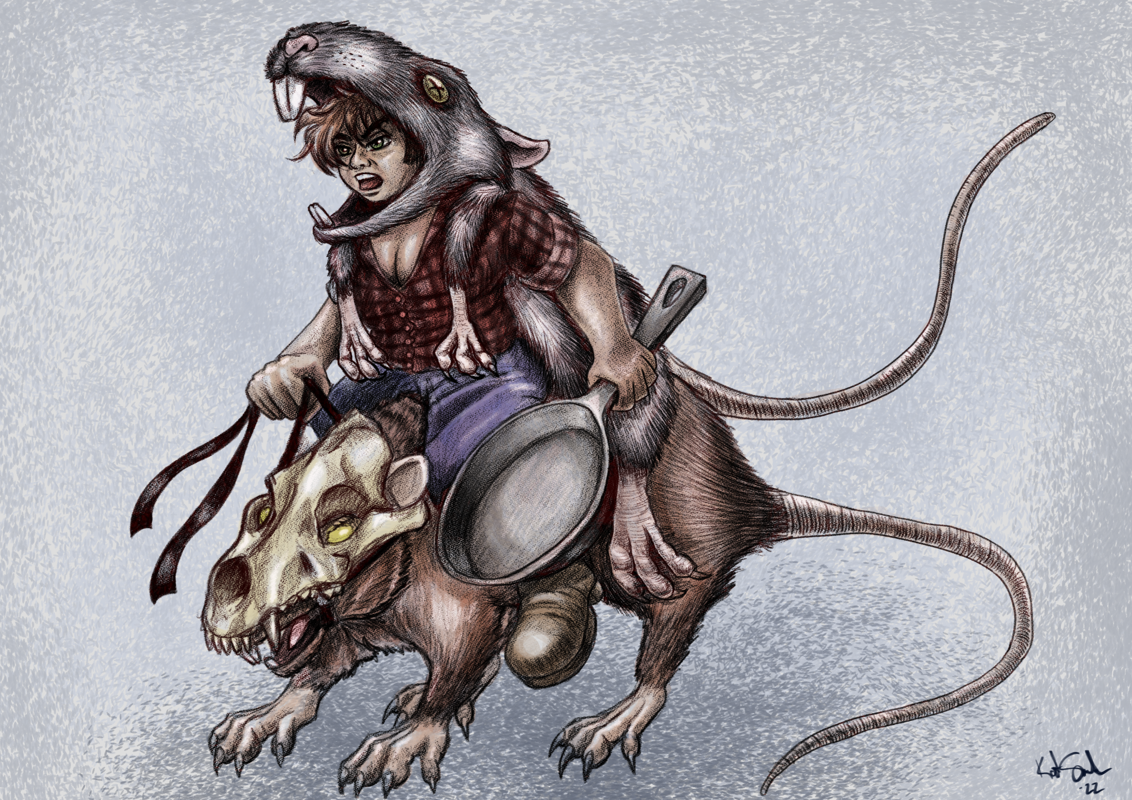 From our Dungeons and Dragons campaign, this is the mighty Halfling Barbarian Chef, Char Frymaster. Here she is pictured astride her mighty Giant Dire Rat steed, Crisco, who wears the skull of a recently-vanquished zombie dog. Yes, that's a giant Dire Rat pelt that Char is wearing. Yes, that intimidated Crisco into being subservient.From our Dungeons and Dragons campaign, this is the mighty Halfling Barbarian Chef, Char Frymaster. Here she is pictured astride her mighty Giant Dire Rat steed, Crisco, who wears the skull of a recently-vanquished zombie dog. Yes, that's a giant Dire Rat pelt that Char is wearing. Yes, that intimidated Crisco into being subservient.0 Comments 0 Shares 2 ViewsPlease log in to like, share and comment!
