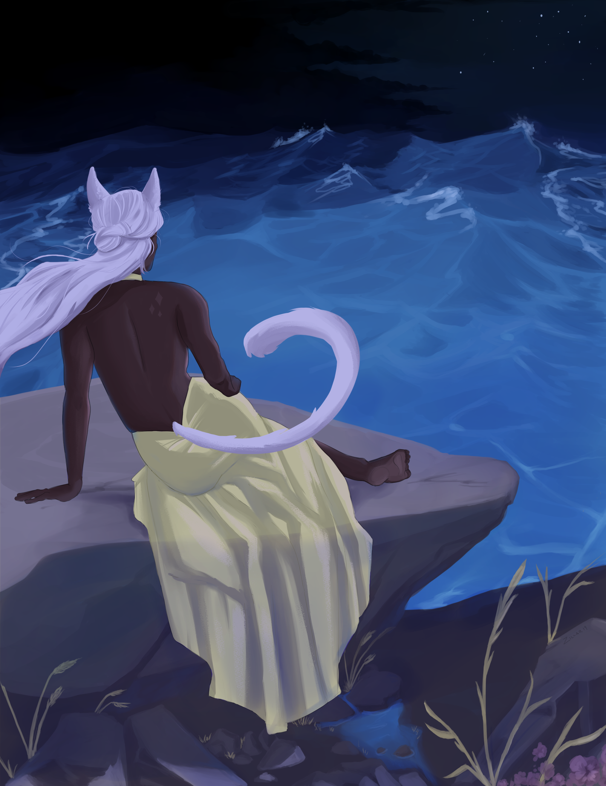 A rare painted piece of my FFXIV character, Reyna Feray. This piece was quite difficult and time consuming for me as I neither paint regularly nor do I typically render backgrounds (and at the time I did this EVEN LESS SO). I realized I do really enjoy painting water so when I do paint that's usually a main feature haha.