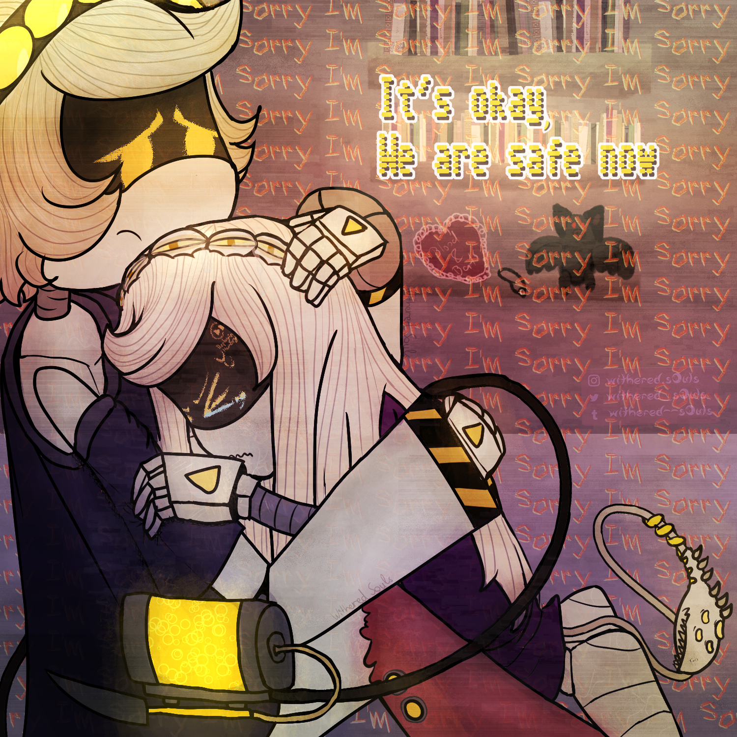 In the background are shelves with books and plushies. The entire art is covered in repeated "I'm sorry" dialouge. In the foreground of this is a highlighted dialouge: "It's okay, We are safe now".
