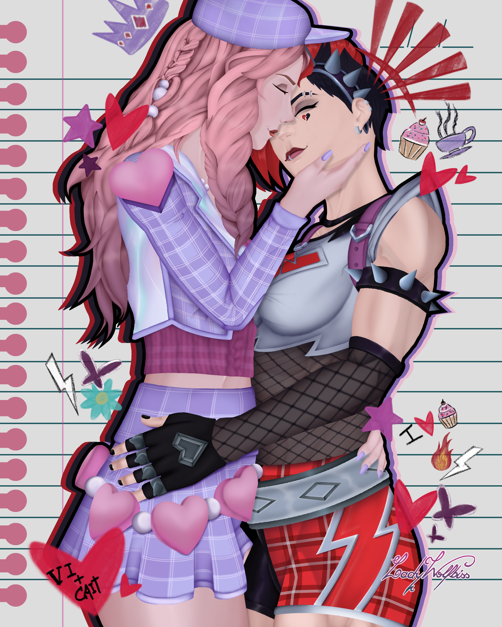 Digital art of the characters Caitlyn and Vi, from the game League of Leagends, hugging each other in celebration of Valentine's Day. Clothing inspired by the Heartache and Heartthrobe skin line.Digital art of the characters Caitlyn and Vi, from the game League of Leagends, hugging each other in celebration of Valentine's Day. Clothing inspired by the Heartache and Heartthrobe skin line.0 Comments 0 Shares 56 Views