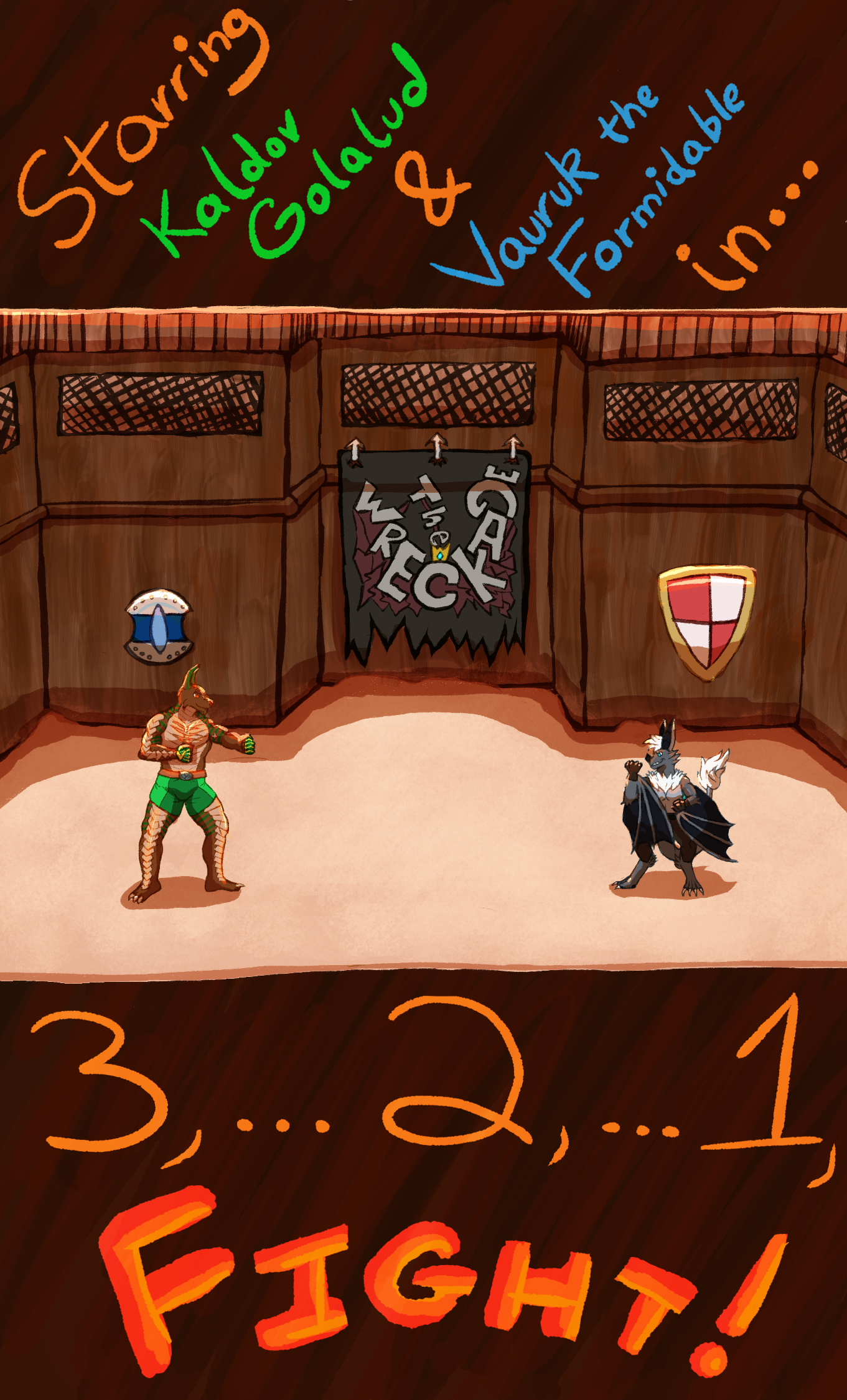 "The Wreckage": a renowned fighting tournament held on a tropical coast in which to the victor truly goes the spoils. It is named for the location of its fights held in a hulled-out hatchway of a wrecked ship. And, on this very day, two rivals meet again to take each other on. On the right stands the "Bronze Breaker" and "Iron Serpent", standing at 7'4": _Kaldov Golalud_; on the left stands the wandering warrior bat, standing at 5'0", _Vauruk the Formidable_. They've fought before, and undoubtedly they'll fight again. But the question on their minds today is--