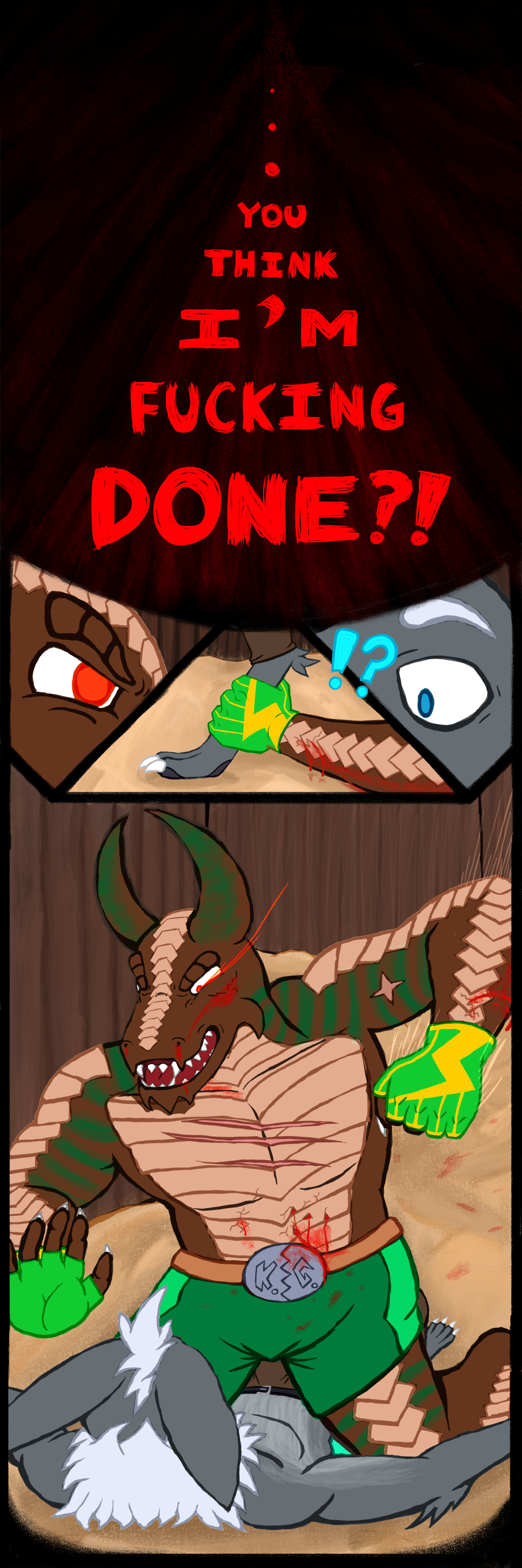 [|< First](https://inkblotapp.page.link/L5N6TCGxgqLkePyM6) | [<< Prev](https://inkblotapp.page.link/oNe93V7Cr88DEsiJ7) | Page 09 | [>> Next](https://inkblotapp.page.link/xU6HM7GeAj5NQrhz6)_“Is it over?”_ Agony had hammered his beaten body. _Twice._ A bell pealed in his head, and its echoes shook his stomach. His hoarse breathing stung like the scales that dug at his flesh. He clenched his eyes against the eternal throb, and only darkness aided him against the piercing sunlight, the celebratory screech, the sweaty stench, and the coppery bile that overcrowded his nerves. _Was it over?_ The thought rasped aloud in his head. On the wavering precipice of consciousness, he sucked in air, closed his hand, shifted his leg; with one step--three taps of the fingers--he could let go. _And … maybe he ought to._ He’d been ineffectual this fight: every move had been doubted, downplayed, disregarded. That announcer cemented it. Vauruk, that fast fucker, had flown laps around him. If this was defeat, it was decisive. Total, even! … at last, V, he’d really … … No. _No._ **Fuck that!** He was Kaldov-**FUCKING**-Golalud. The Bronze Breaker; the Thrashing Titan; the Iron Serpent. No matter what, he believed it for every single match: he was going to fucking win. Grasping that resolve, he turned, stepping away from that precipice, turning his eyes back to the light, hurling the pain into the fire and letting it fuel his blazing body. He wrenched himself up from the ground, flipping over. The bat was there, reveling, angled just away, a hair’s breadth too far. The sand mixed with blood on his stomach as he lurched. With a serpentine grip he seized Vauruk’s ankle. The warrior bat saw, gasped: blurrily Kaldov clutched the other one and yanked as Vauruk resisted. Kaldov roared as red dripped down his face, his arms, his body. Vauruk’s balance was forfeit: down he tumbled to the sand. Kaldov bared his teeth and volleyed forward as the flipped bat backpedaled, kneeing Vauruk's stomach. The announcer didn’t get a chance to narrate: it was Kaldov’s turn to tell the world what was happening. ***“YOU THINK I’M FUCKING DONE?!”*** An arm reeled back, a fist tensed, Kaldov unleashed a barrage of his might onto the warrior bat’s skull. ----- **Author's Note**: This is a page from a comic that [Vauruk](https://inkblot.art/profile/Vauruk) and I did for ArtFight 2023. It stars our boys, Kaldov Golalud (by me) and Vauruk the Formidable (by [Vauruk](https://inkblot.art/profile/Vauruk)). We intend to upload the pages of this series cooperatively, alongside the accompanying writing, over the next few days. The content will include violence and mild gore, and pages containing the latter will be tagged as such when warranted. Thanks for following along, and I hope you enjoy this! [|< First](https://inkblotapp.page.link/L5N6TCGxgqLkePyM6) | [<< Prev](https://inkblotapp.page.link/oNe93V7Cr88DEsiJ7) | Page 09 | [>> Next](https://inkblotapp.page.link/xU6HM7GeAj5NQrhz6)0 Comments 0 Shares 14 Views