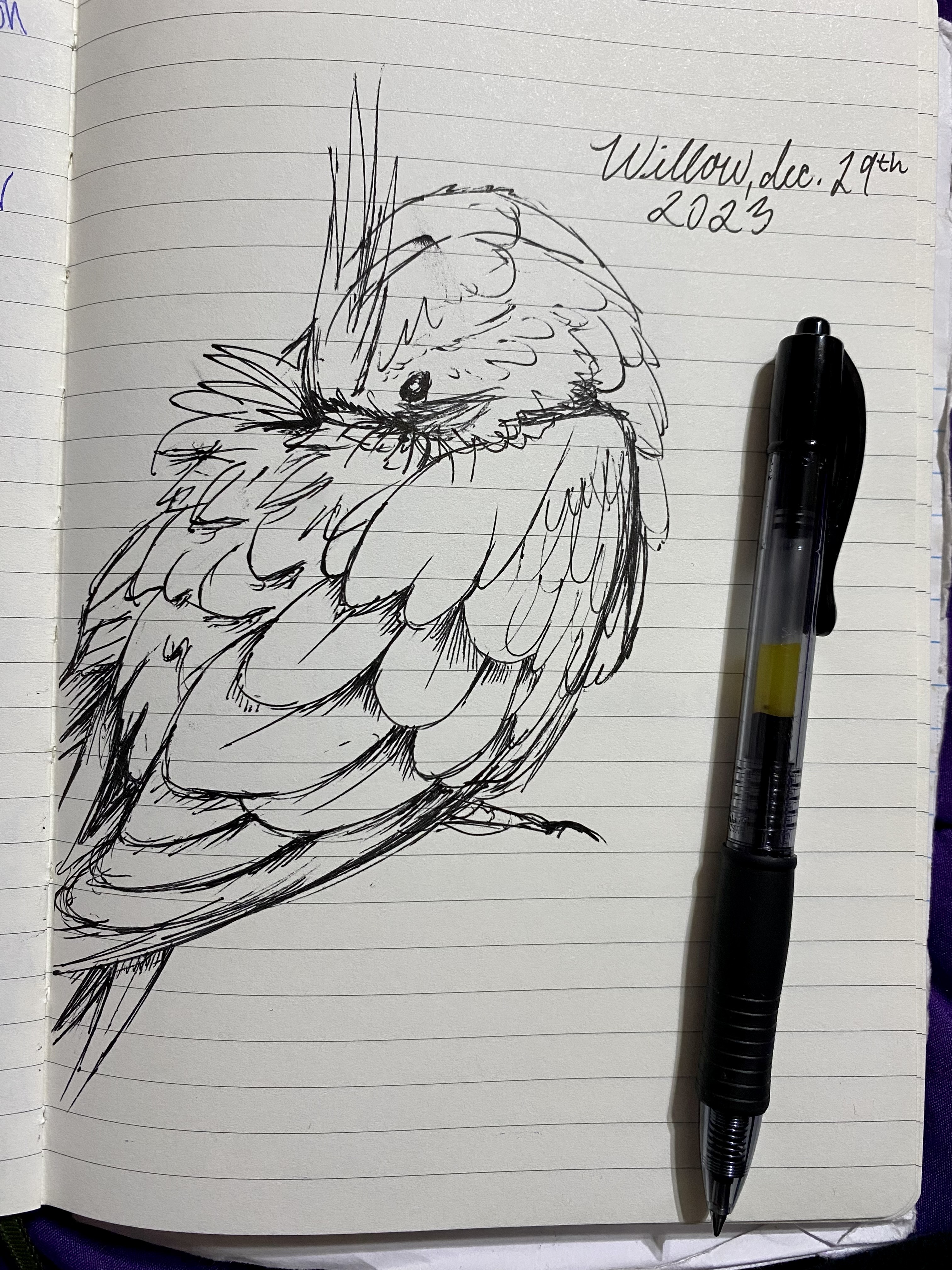 A pen sketch of my cockatiel from today in my grimoire. Such a steady museA pen sketch of my cockatiel from today in my grimoire. Such a steady muse0 Comments 0 Shares 3 Views
