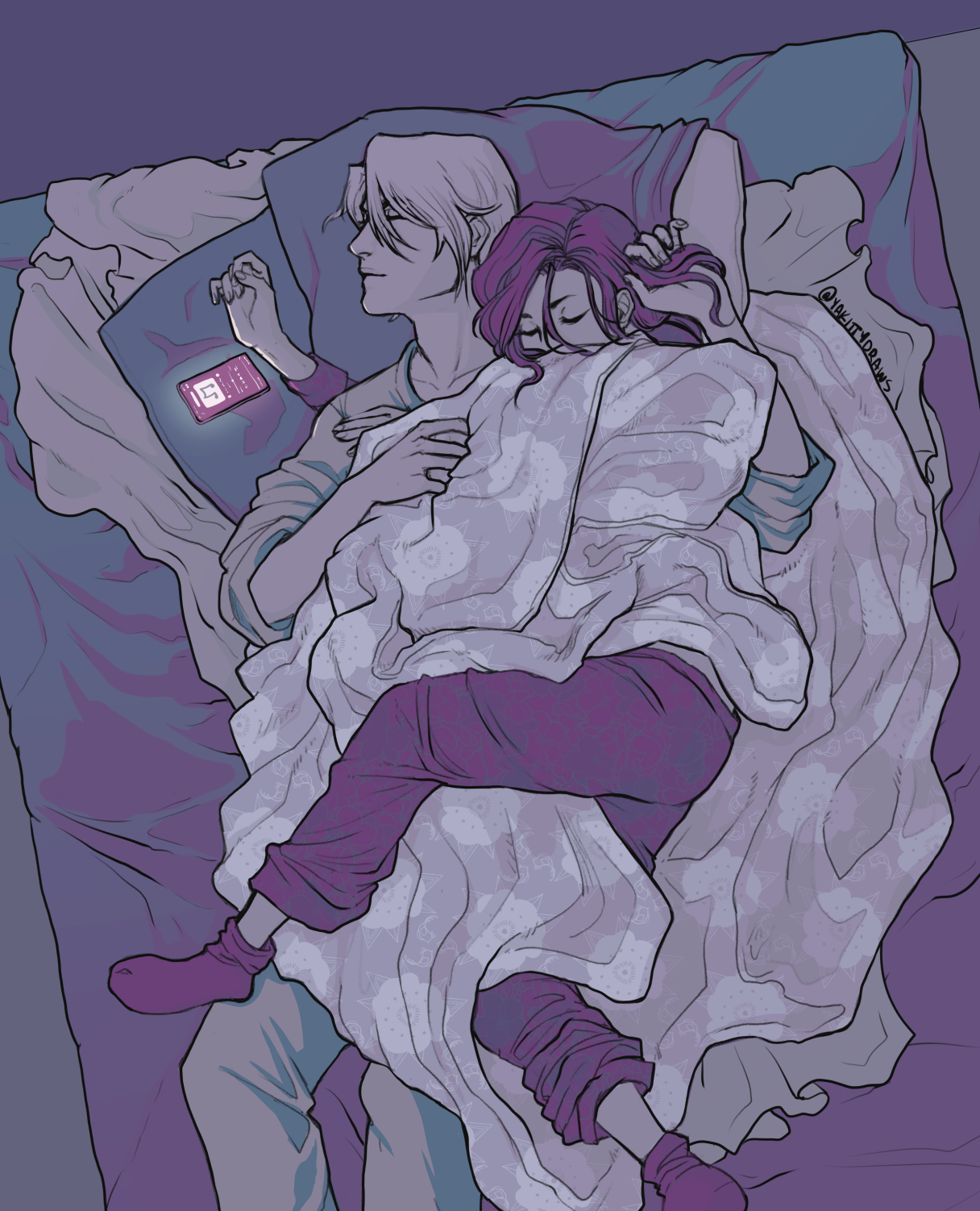 A study of fabric and posing that turned into a wholesome piece of mine and a friend's characters, Elroy (blonde, he/him) and Nanette (she/her).