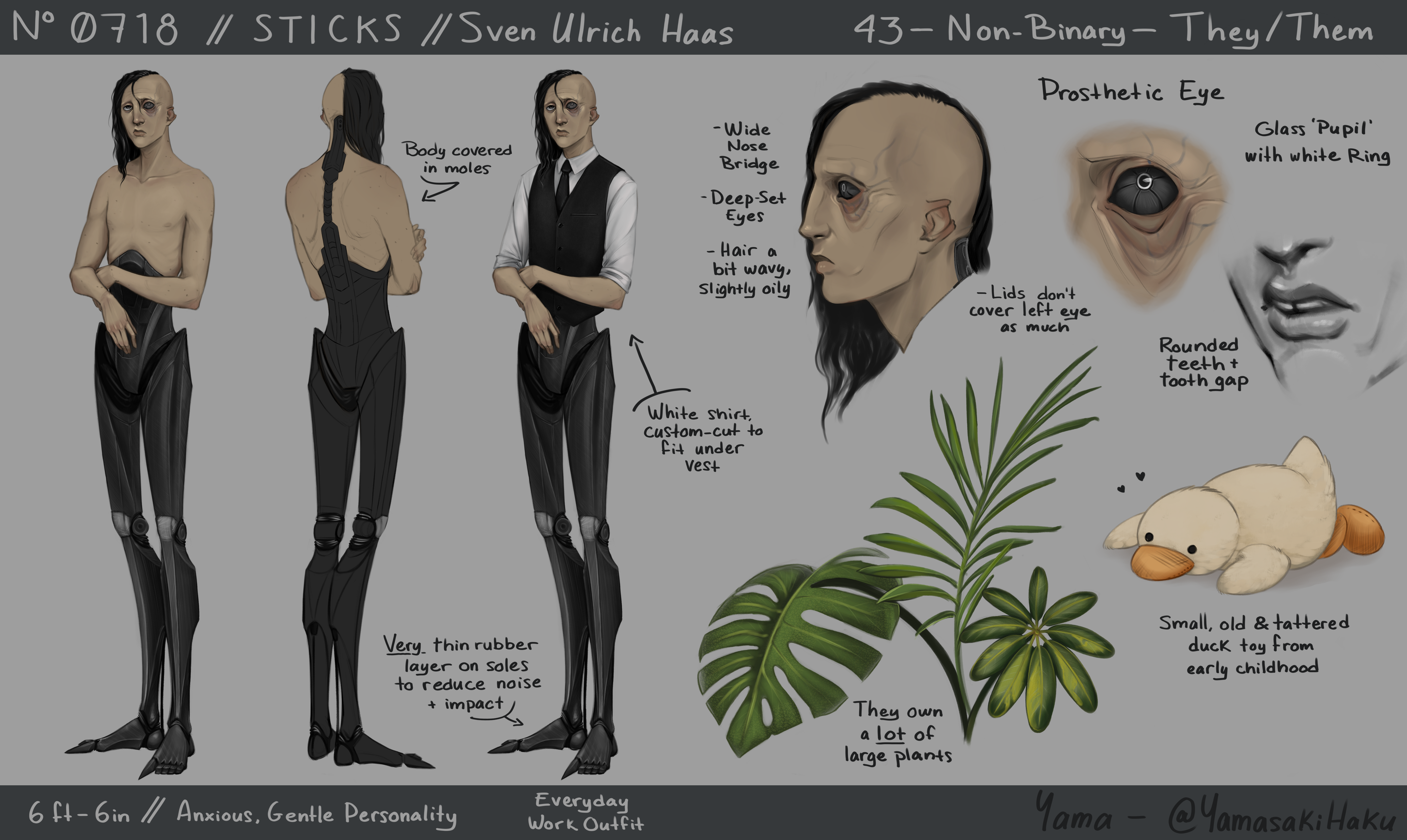 Despite their looks, they are most polite, if not out of fear, and are as anxious as they are gentle.Misfortune incarnate. (They/Them) Secret child of a secret relationship led by a former Hunter of the Agency. Aged 4, their mother was assassinated and the house was burnt down. They spent years in an orphanage, and around age 12, the Agency eliminated the father and kidnapped them from the orphanage. They were forced to grow up fast in an hostile environment where it was made very clear from the beginning that no one wanted them here. They have now been in these conditions for 31 years. Illness and disease slowly took their legs over time, then took their lower torso, forcing them to adapt and have them replaced bit by bit. As for their face, a simple accident while they were tinkering with the prototype mechanisms for their replacement limbs. A piece under high tention broke and flew right into their eye. Despite their looks, they are most polite, if not out of fear, and are as anxious as they are gentle.0 Comments 0 Shares 21 Views