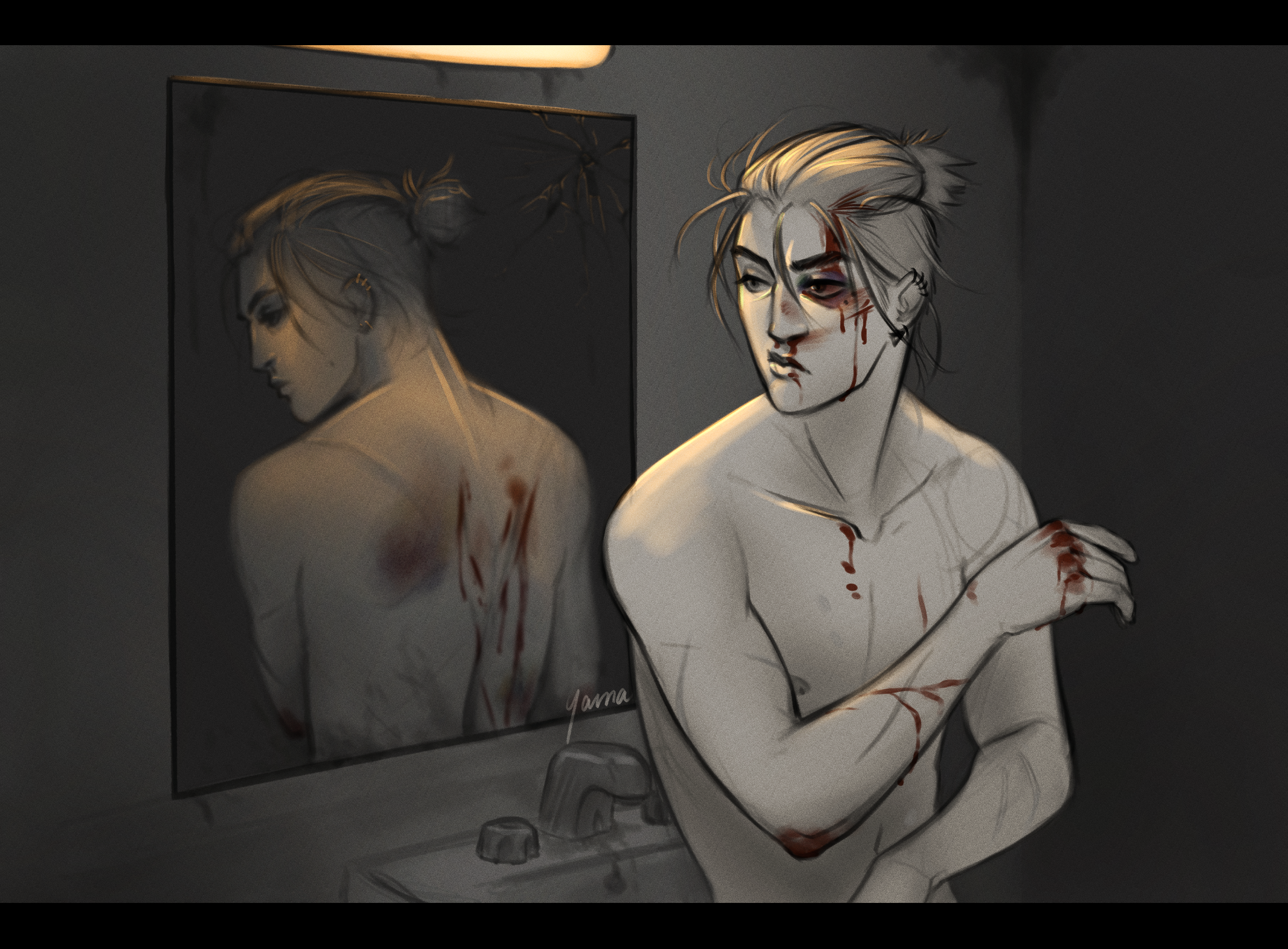 Illness and disease slowly took their legs over time, then took their lower torso, forcing them to adapt and have them replaced bit by bit. As for their face, a simple accident while they were tinkering with the prototype mechanisms for their replacement limbs. A piece under high tention broke and flew right into their eye.