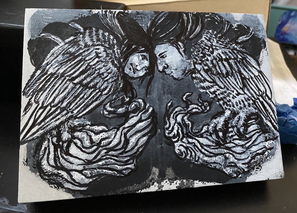 Made in acrylic and pen on wood surface 5x7”Rorschach inspired image in greys of two harpies. One is young and the other is old. They are perched on two opposite limbs and touching foreheads affectionately. Made in acrylic and pen on wood surface 5x7”0 Comments 0 Shares 12 ViewsPlease log in to like, share and comment!
