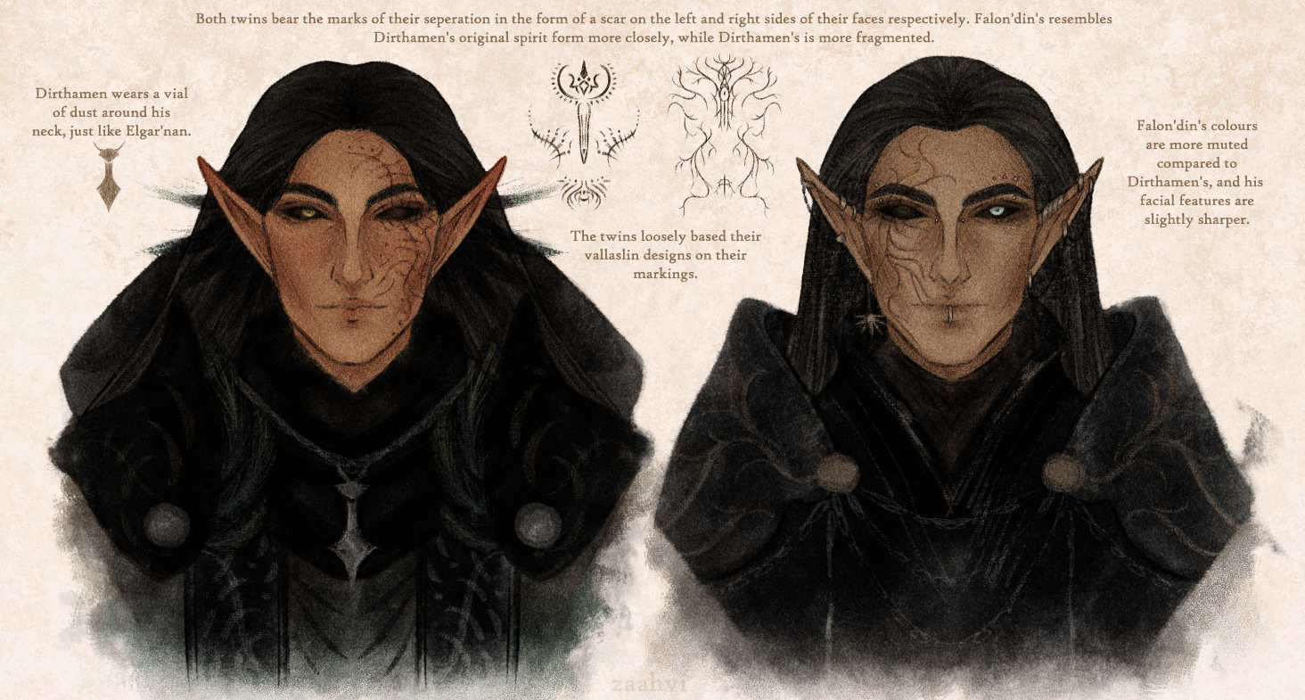 also, while i draw elgar'nan a lot, dirthamen is actually my fav evanuris. he is so fucking mysterious and weird and i need to look inside of his brain.some concepts for dirthamen and falon'din, two more evanuris from dragon age - i was a little disappointed by the lack of new evanuris info in veilguard so i started to make my own headcanons and designs of them. **for context (canon!):** these two were once one spirit that for some reason split into two parts, who took two different bodies and from then on were known as "twin souls". as far as we know dirthamen was a god of knowledge and secrets, and falon'din was a god of the dead who was also a bit of an asshole i guess. or rather a lot. **my headcanon:** dirthamen was once an archivist spirit (knowledge/guidance) who was asked by elgar'nan to join him in making a body. their spirit split because it was conflicted on whether it wanted to craft a body for itself. dirthamen remained with his original spirit intact; while falon'din, the part who wanted to remain a spirit, was twisted into despair. also, while i draw elgar'nan a lot, dirthamen is actually my fav evanuris. he is so fucking mysterious and weird and i need to look inside of his brain.0 Comments 0 Shares 25 Views -