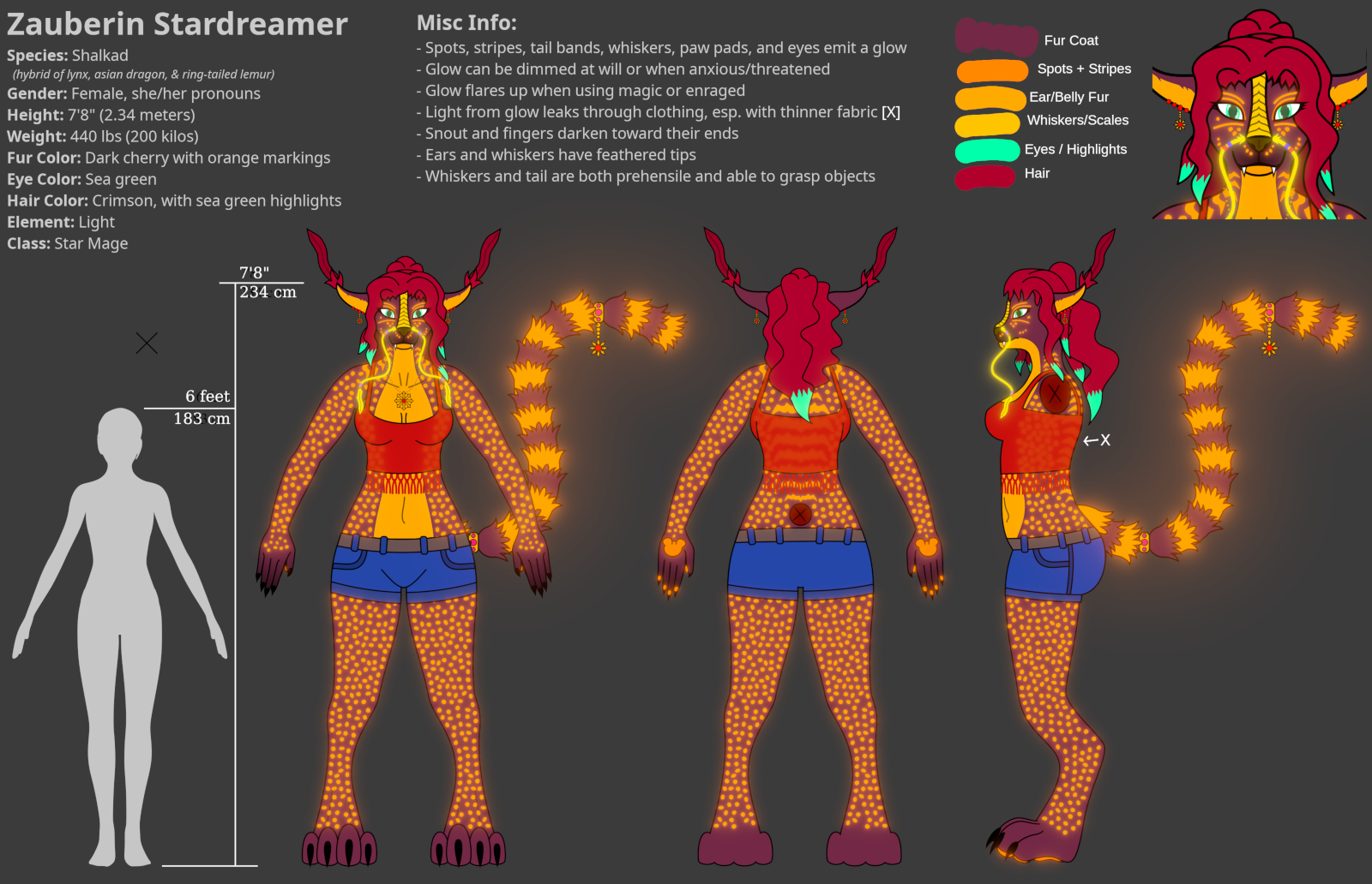 This is the current ref sheet for my fursona, a hybrid of lynx, eastern dragon, and a little bit of ring-tailed lemur, with glowing spots and stripes :3c