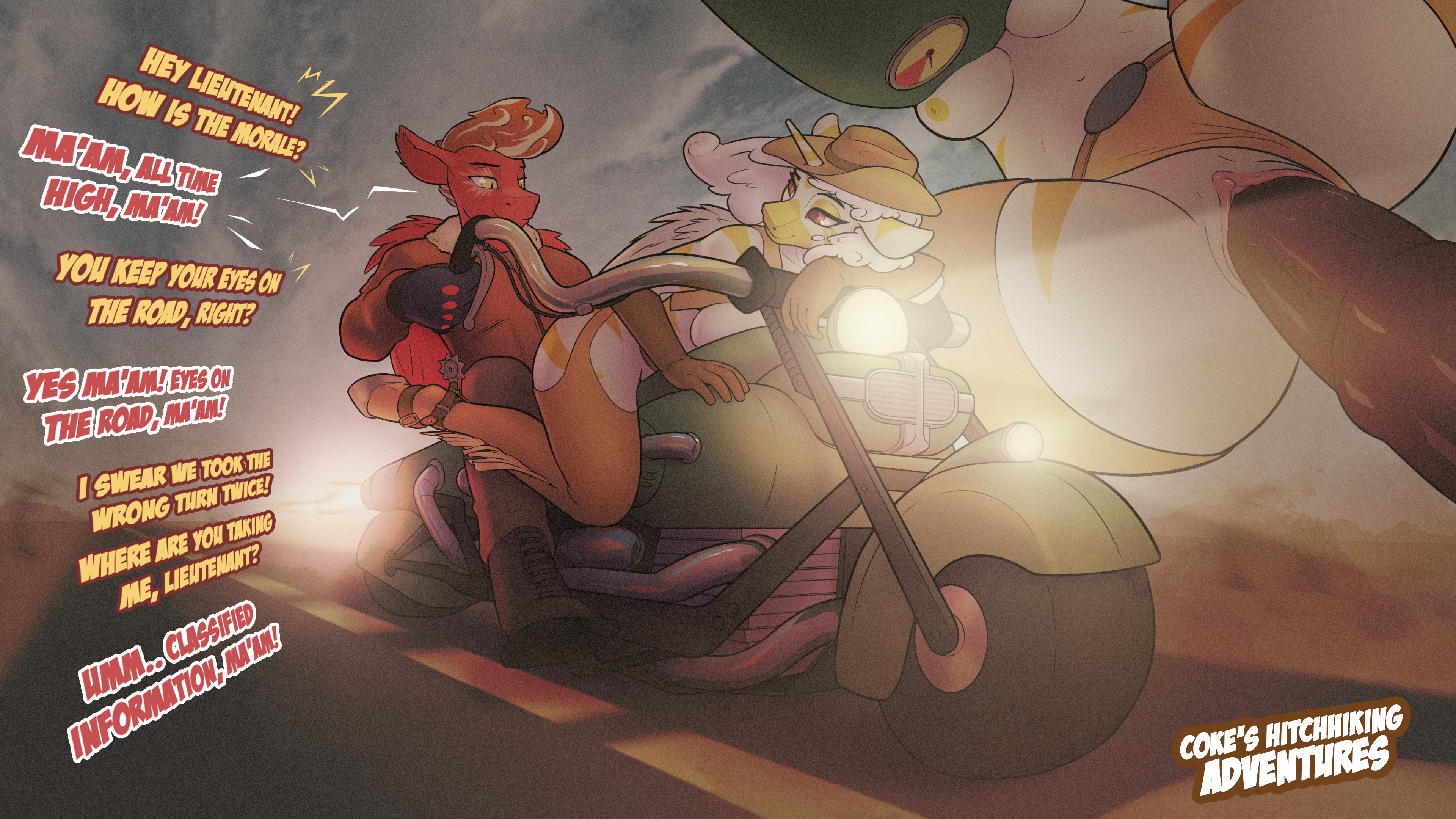 Heeeey... Are we're heading in the right direction?Finally, the heat and sand are left behind! Bye bye Desert! Hello... Barren Lands... A beautiful country of withered trees, dreary farms and tumbleweeds. Favorite place of bandits, raiders and tentacle obsessed villagers with a crazy look and spooky customs. Great! At least I got lucky with the ride. A pegasus soldier named Martini stopped next to me on a cool motorbike. Convincing him to give me a ride was as easy as it gets. I'm not showing off these babies for nothing after all! I love to ride motorbikes together, it's so exciting and hot! I decided not to wait for the stop and started teasing his junk with my ass right in the middle of a ride. I did not expect that he would immediately shove his dick inside me like that. Cocky little bastard. I've never been fucked on a bike like this before! Heeeey... Are we're heading in the right direction?0 Comments 0 Shares 10 Views -