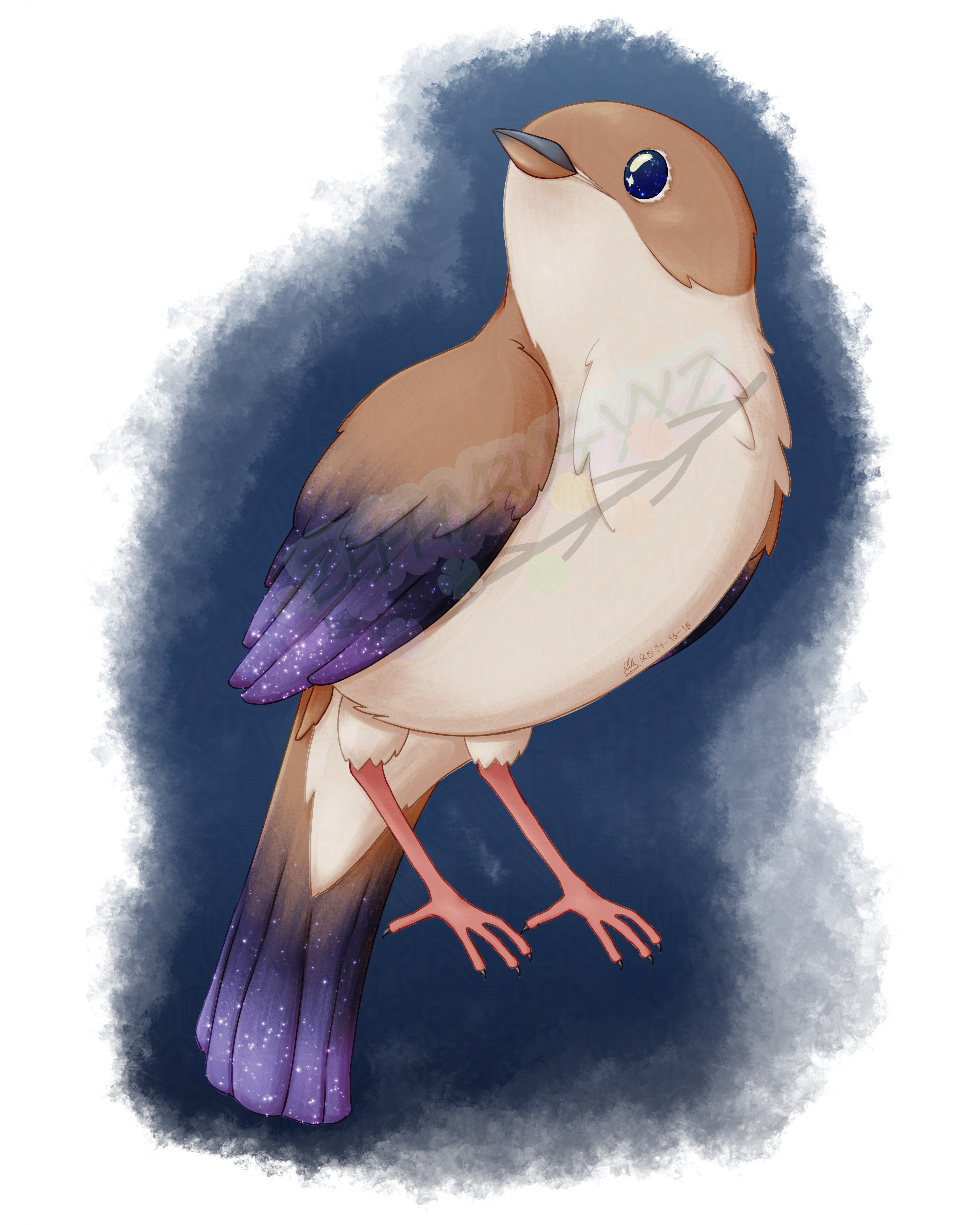 _Image Description: A fullbody illustration of Boreas, Zeph's character. Boreas matches the physical features of a nightingale bird. He has brown and beige feathers, his tail and wing feathers fading into a dark blue, then into a lighter blue. The blue parts of his feathers are speckled with white, star-like dots across the feathers. His feet are pink, his beak is grey and brown. Boreas' eyes are a dark blue and sparkly, with large yellow highlights - One of which is shaped like a star._First post here,,, have cosmic bird oc,,, _Image Description: A fullbody illustration of Boreas, Zeph's character. Boreas matches the physical features of a nightingale bird. He has brown and beige feathers, his tail and wing feathers fading into a dark blue, then into a lighter blue. The blue parts of his feathers are speckled with white, star-like dots across the feathers. His feet are pink, his beak is grey and brown. Boreas' eyes are a dark blue and sparkly, with large yellow highlights - One of which is shaped like a star._0 Comments 0 Shares 9 Views -