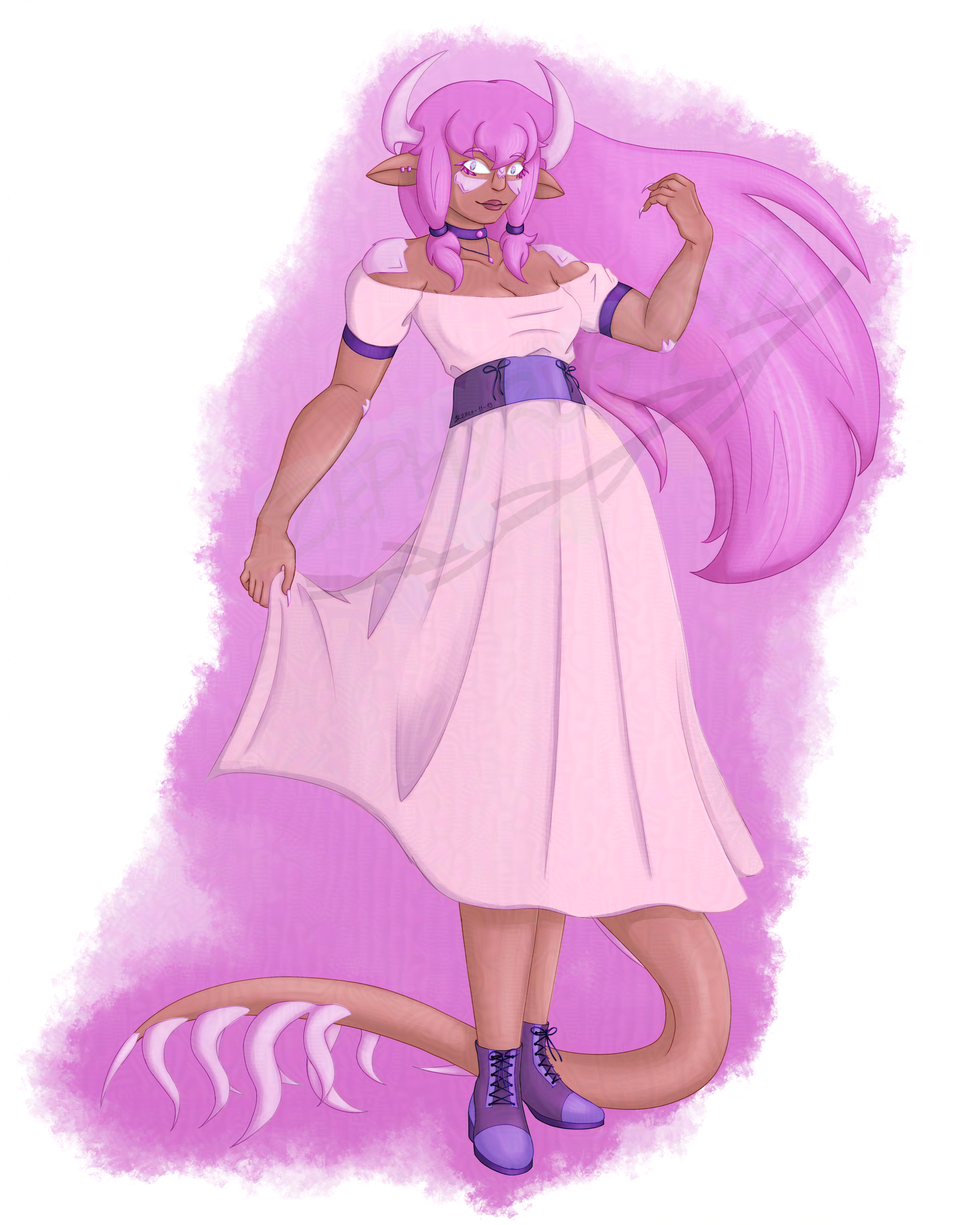 _Image Description: A fullbody illustration of Angelica, Zeph's character. Angelica is a humanoid with draconic features. Angelica has straight pink hair that reaches just around her midthighs. She has light brown skin with soft pink scales on her elbows, shoulders, and cheeks. Her upright horns and the spikes on her tail are of a similar color. Her eyes are pink with light blue sparkle-like stars in the middles. Angelica wears a near-white pink dress that reaches her shins with a purple corset-like waist piece and purple ankle boots.__Image Description: A fullbody illustration of Angelica, Zeph's character. Angelica is a humanoid with draconic features. Angelica has straight pink hair that reaches just around her midthighs. She has light brown skin with soft pink scales on her elbows, shoulders, and cheeks. Her upright horns and the spikes on her tail are of a similar color. Her eyes are pink with light blue sparkle-like stars in the middles. Angelica wears a near-white pink dress that reaches her shins with a purple corset-like waist piece and purple ankle boots._0 Comments 0 Shares 6 Views