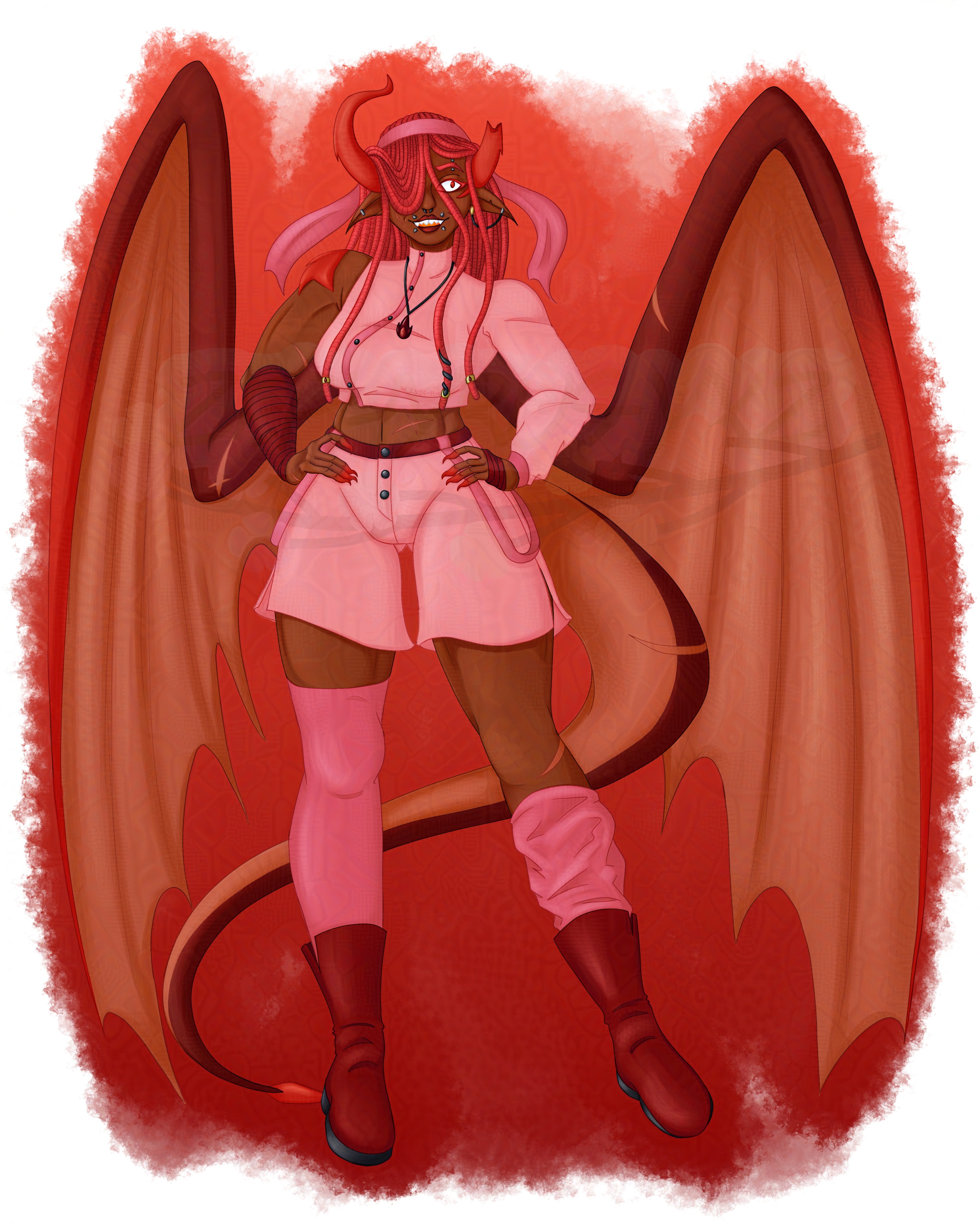 _Image Description: A fullbody illustration of Eiroto, Zeph's character. Eiroto is a draconic humanoid with scarred, dark brown skin and droopy, pointed ears. She has right red features like clawed fingertips, a bright red scale patch on her shoulder, and curved horns. The left one is broken. She has large wings that start as a dark burgundy color to bright red at the rims. She has a long burgundy tail with a light brown underside, a bright red spike on the tip of it. Her bright red dreadlocks reach her mid-back, some hair covering her right eye. She wears a pink asymmetrical shirt, socks, shorts, and a ribbon around her head, with dark red boots and wraps on her arms.__Image Description: A fullbody illustration of Eiroto, Zeph's character. Eiroto is a draconic humanoid with scarred, dark brown skin and droopy, pointed ears. She has right red features like clawed fingertips, a bright red scale patch on her shoulder, and curved horns. The left one is broken. She has large wings that start as a dark burgundy color to bright red at the rims. She has a long burgundy tail with a light brown underside, a bright red spike on the tip of it. Her bright red dreadlocks reach her mid-back, some hair covering her right eye. She wears a pink asymmetrical shirt, socks, shorts, and a ribbon around her head, with dark red boots and wraps on her arms._0 Comments 0 Shares 5 Views
