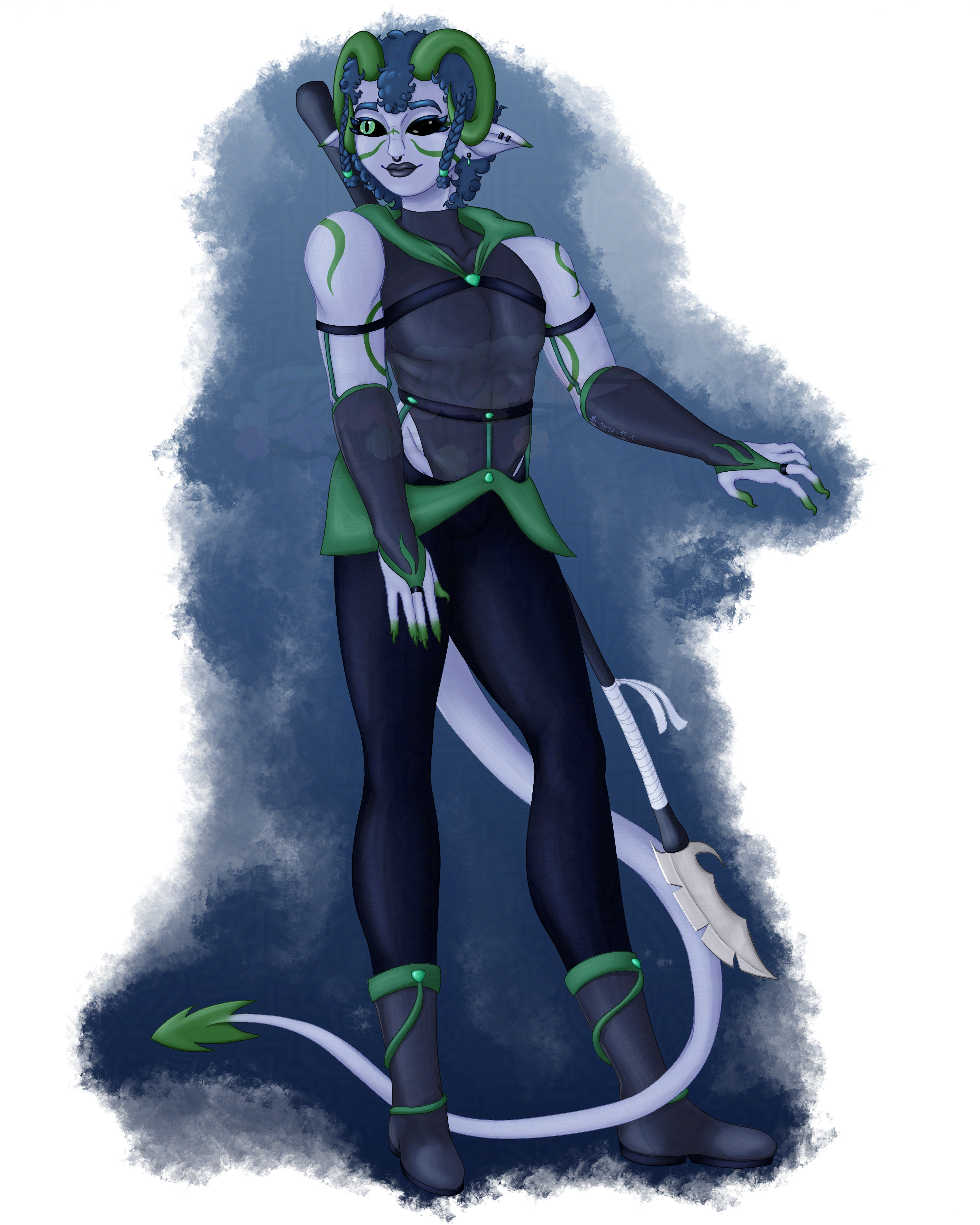 Image Description: A fullbody illustration of Eivier, Zeph's character. Eivier is a Demon with clawed fingers, a tail, and pale blue skin, covered in green, vine-like markings. He has curly dark grey-blue hair with braids framing either side of his face. Their green horns are curved, sprouting backward before spiraling forward and up. His left eye is fully black, while his right eye has a light green iris with light blue in it, as well as a black sclera. Eivier's clothing is mostly form-fitting, consisting of dark blues and a couple of shades of green. They have a glaive attached to the belt around their chest.Image Description: A fullbody illustration of Eivier, Zeph's character. Eivier is a Demon with clawed fingers, a tail, and pale blue skin, covered in green, vine-like markings. He has curly dark grey-blue hair with braids framing either side of his face. Their green horns are curved, sprouting backward before spiraling forward and up. His left eye is fully black, while his right eye has a light green iris with light blue in it, as well as a black sclera. Eivier's clothing is mostly form-fitting, consisting of dark blues and a couple of shades of green. They have a glaive attached to the belt around their chest.0 Comments 0 Shares 8 Views
