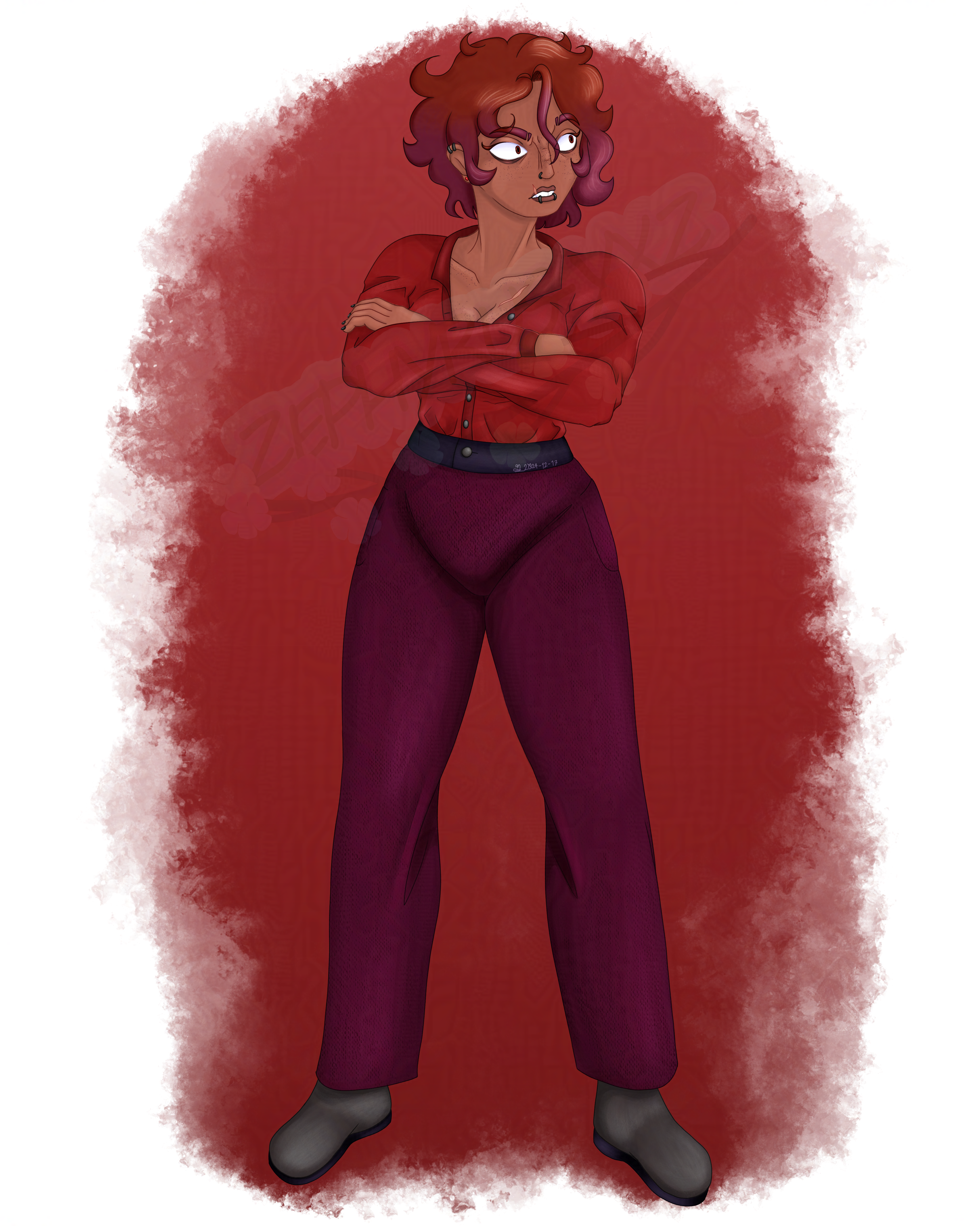 _Image Description: A fullbody illustration of Hilda, Zeph's character. Hilda is standing with her arms crossed over her chest. She has mid-tone brown skin with freckles across her face and chest. She has a few scars, thick brows, a gap between her teeth, and dark eyebags. Hilda's hair reaches the middle of her neck and is a dark orange-red color with a burgundy coloration at the ends. Hilda is wearing a dark red button-down with some of the top buttons undone, dark burgundy pants with a dark blue waist band, and dark grey boots._Arf arf... Pretty... _Image Description: A fullbody illustration of Hilda, Zeph's character. Hilda is standing with her arms crossed over her chest. She has mid-tone brown skin with freckles across her face and chest. She has a few scars, thick brows, a gap between her teeth, and dark eyebags. Hilda's hair reaches the middle of her neck and is a dark orange-red color with a burgundy coloration at the ends. Hilda is wearing a dark red button-down with some of the top buttons undone, dark burgundy pants with a dark blue waist band, and dark grey boots._0 Comments 0 Shares 6 ViewsPlease log in to like, share and comment! -